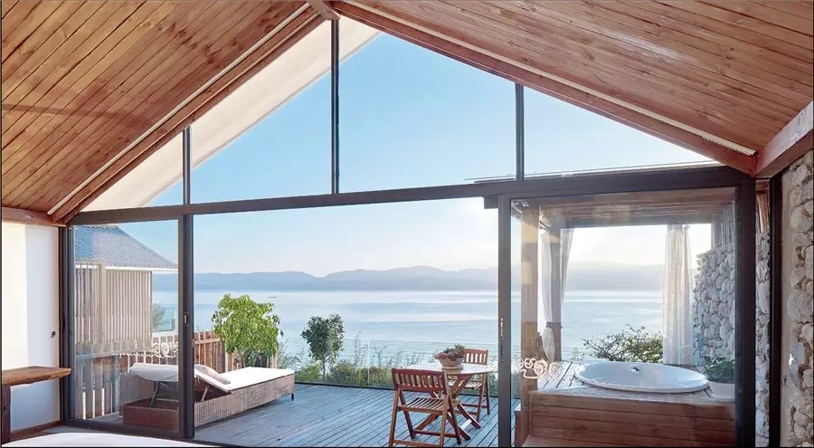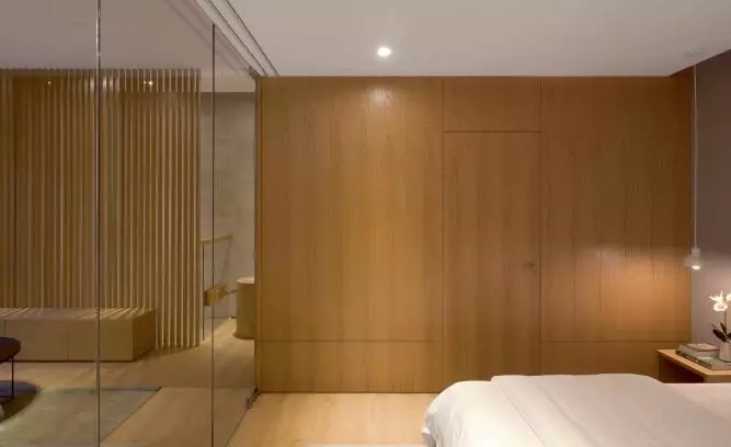 房間運用精簡的材料以及簡約的設計手法,將室外景觀引進室內,各空間有景觀環繞的同時,又保證了空間的私密性。