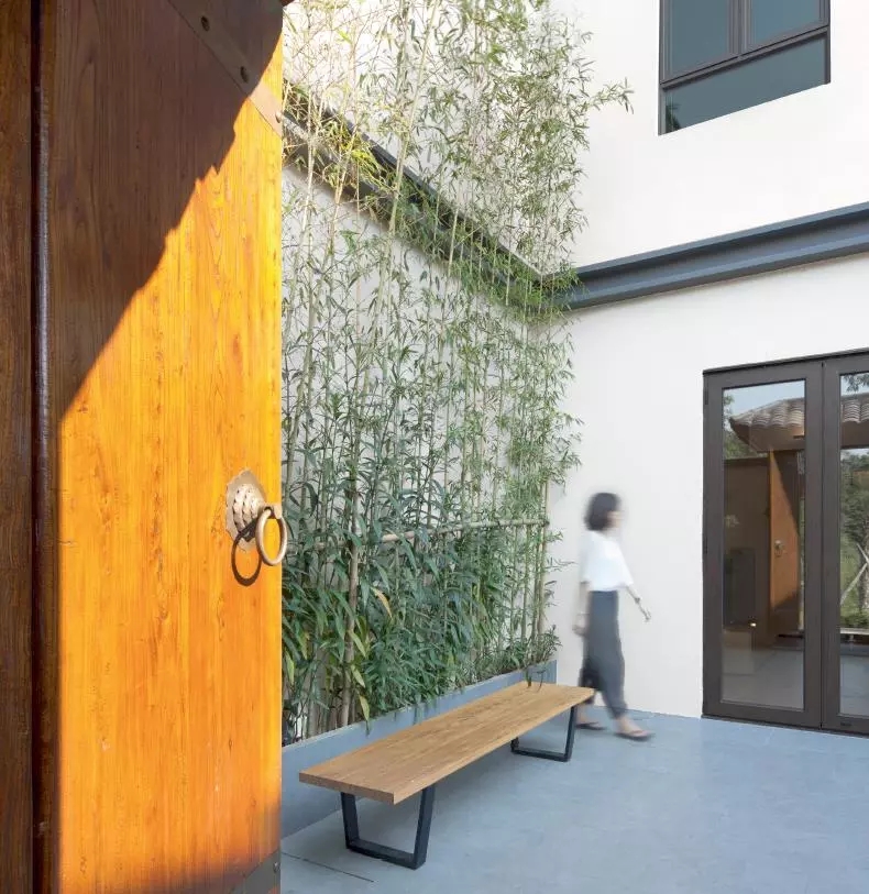 橡木質地堅硬,顏色飽滿自然,紋理清晰,制成的家具結實耐用。配合灰色地磚、青翠竹子,將入戶花園打造得十分悠閑、安謐。