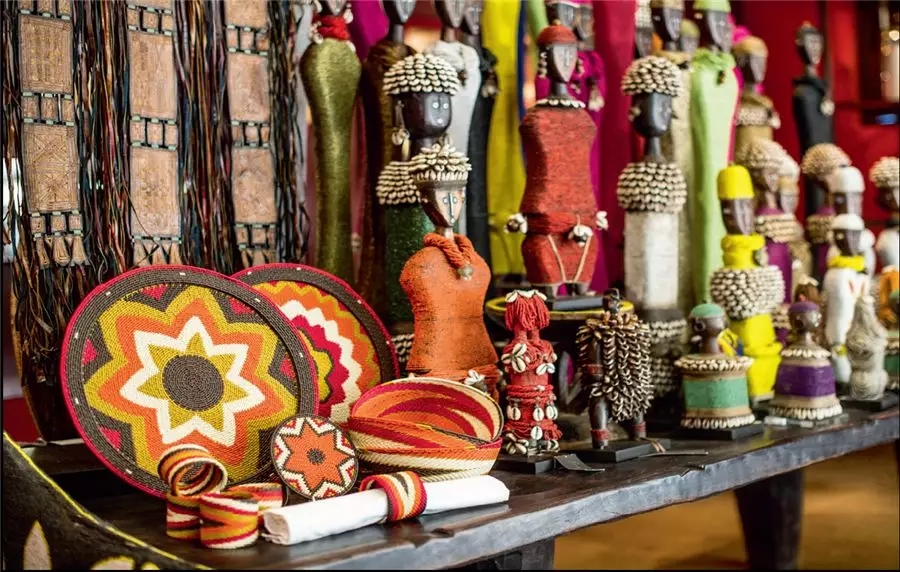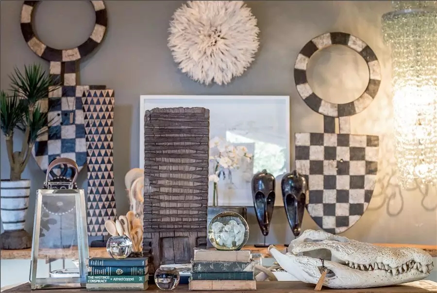南非風情也是整個空間中必不可少的元素,木雕工藝品和曼陀羅花樣的編織物處處透露出濃重的民族風情,明艷大膽的顏色更讓人錯不開眼。