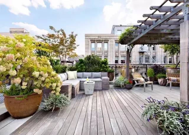 ▲給陽臺地面鋪上環保自然的防腐木,再搭配一些簡單而不失設計感的戶外家具,種上花花草草,把它裝點成舒適的休閑區,每一個視角都能成為美麗的風景。