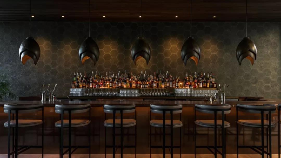 定制家具和固定裝置,如懸掛式燈籠、六英尺圓形燈燭臺、弧形黃銅天花板細節以及皮質墻壁增添了酒店獨特的空間感。