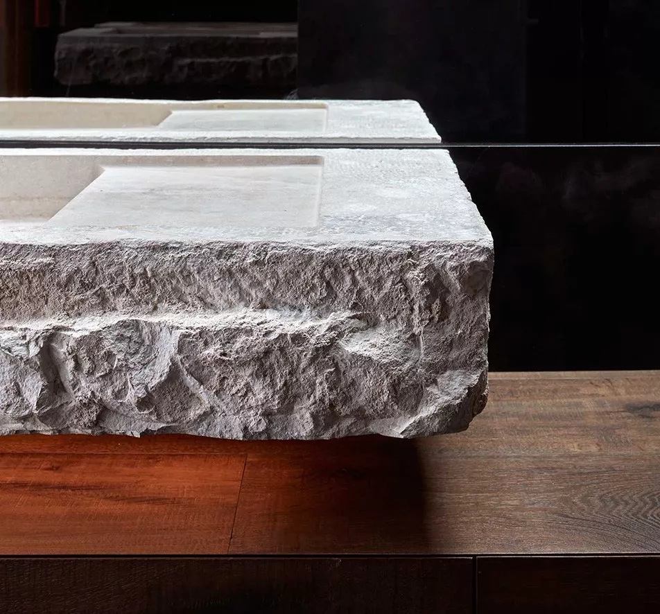 踩著石板地進(jìn)入衛(wèi)生間,木板墻上的銅制器具和擁有原始形狀的石料臺(tái)盆,營(yíng)造出一個(gè)別致的高雅氛圍。