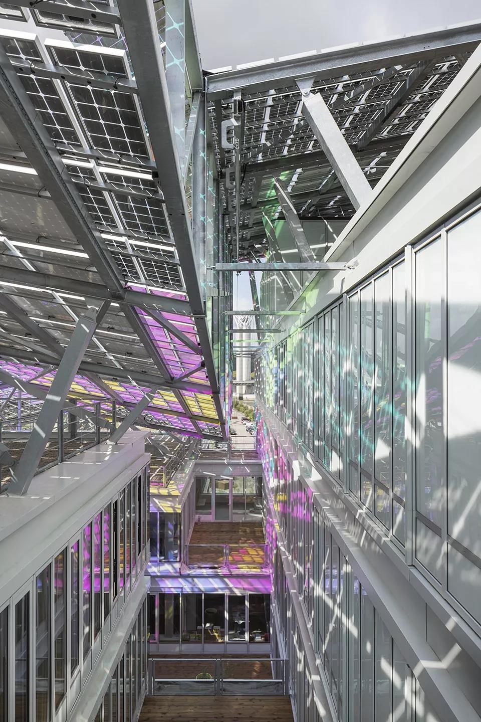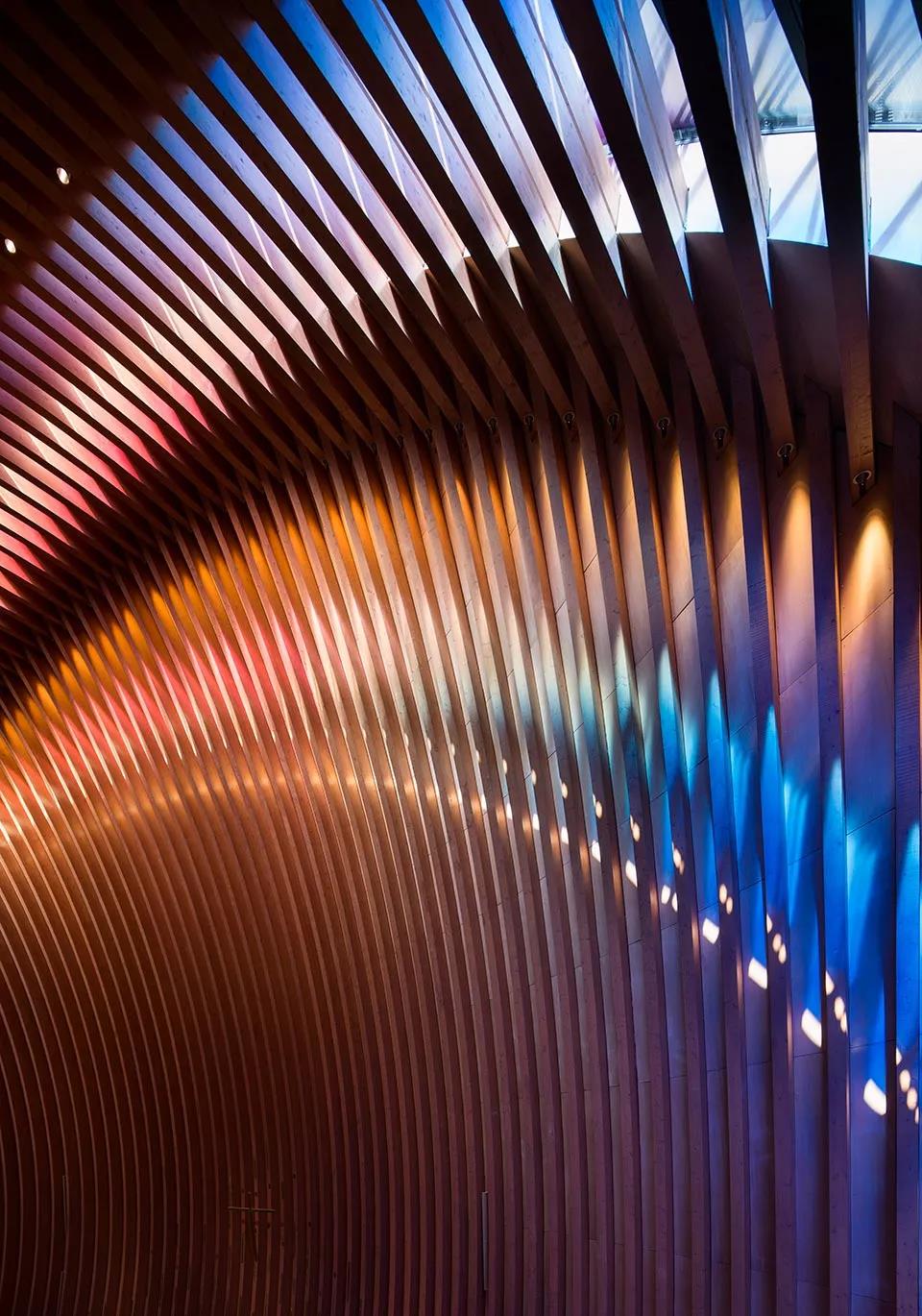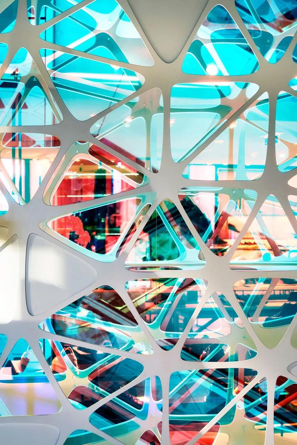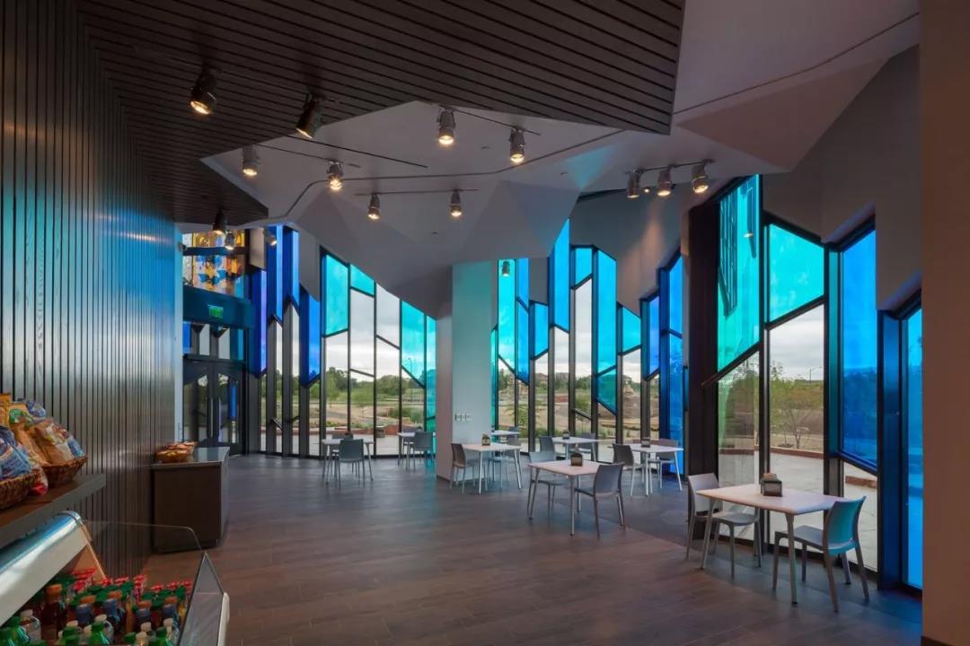 為了真正捕捉到火的精髓,設(shè)計(jì)團(tuán)隊(duì)使用由 Goldray Glass(建筑裝飾玻璃生產(chǎn)商)的研發(fā)團(tuán)隊(duì)與 3M 聯(lián)手創(chuàng)造的變色玻璃。