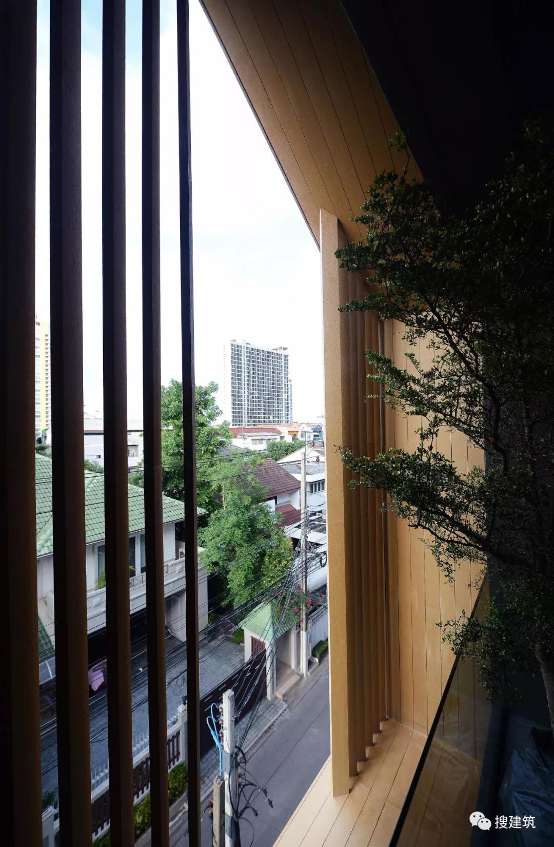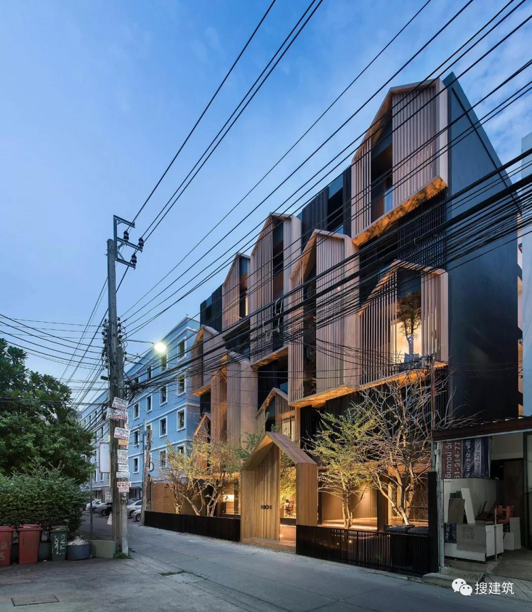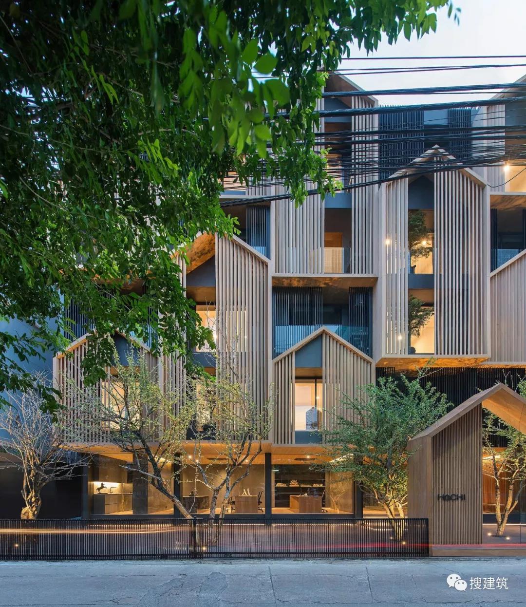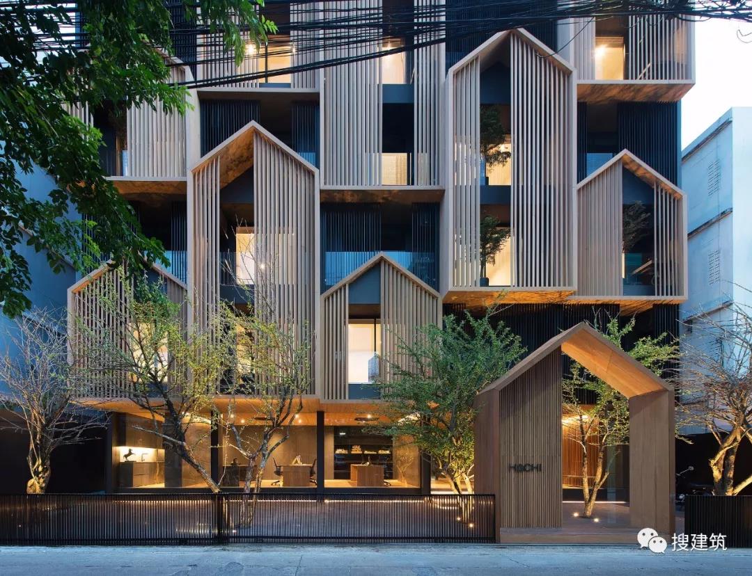 The building composes of several modular gable stories, each of them is orderly differentiated, including different depth, lath orientation and height. With a perfect combination of those modules that makes them like harmony rhythm as if the building is a vertical village.