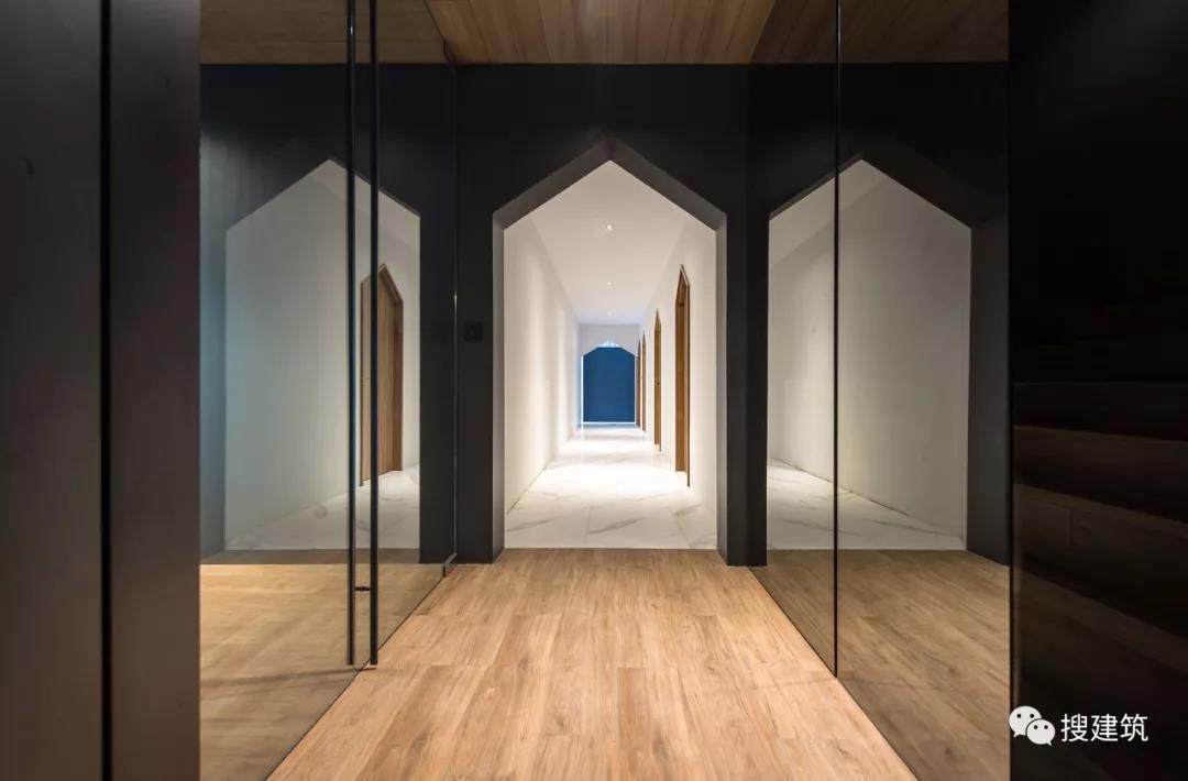 The interior space is inspired by an analogic idea of ancient eastern people, who organized spaces by dividing each of activity areas in a sequence. Similarly, each of internal phases has an emotional design divided by gable arches that are related with exterior fa?ade to switching people’s emotion by bright and dark areas that begin from the entrance through stair hall and corridor.