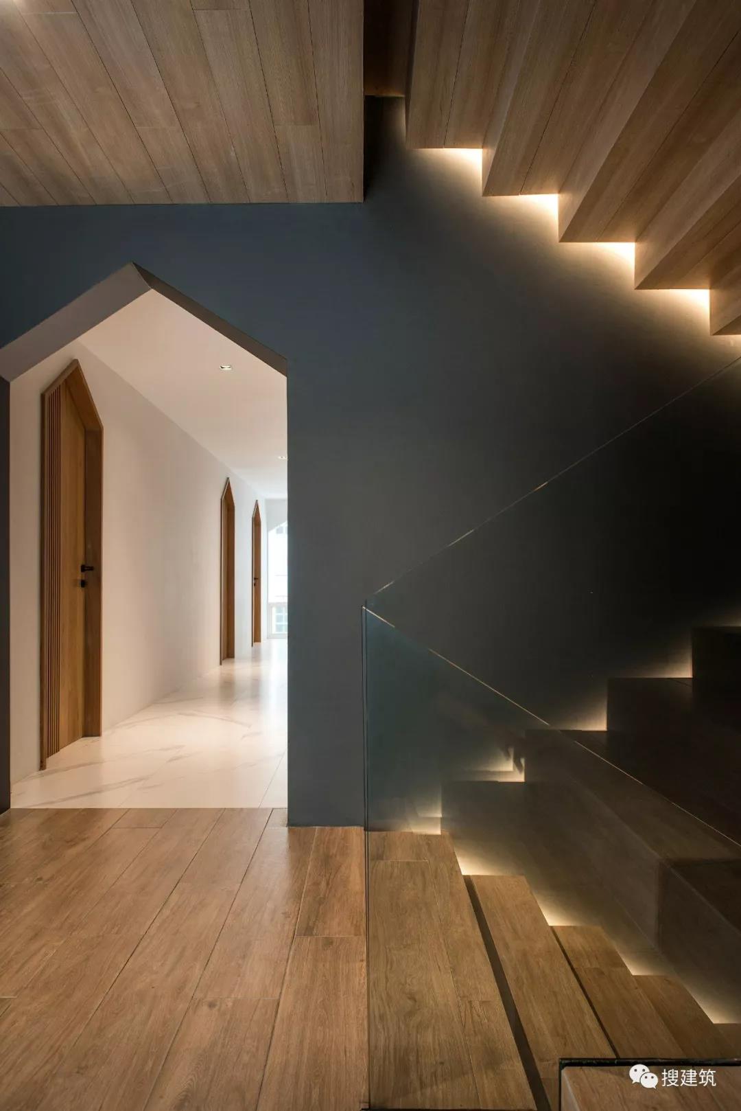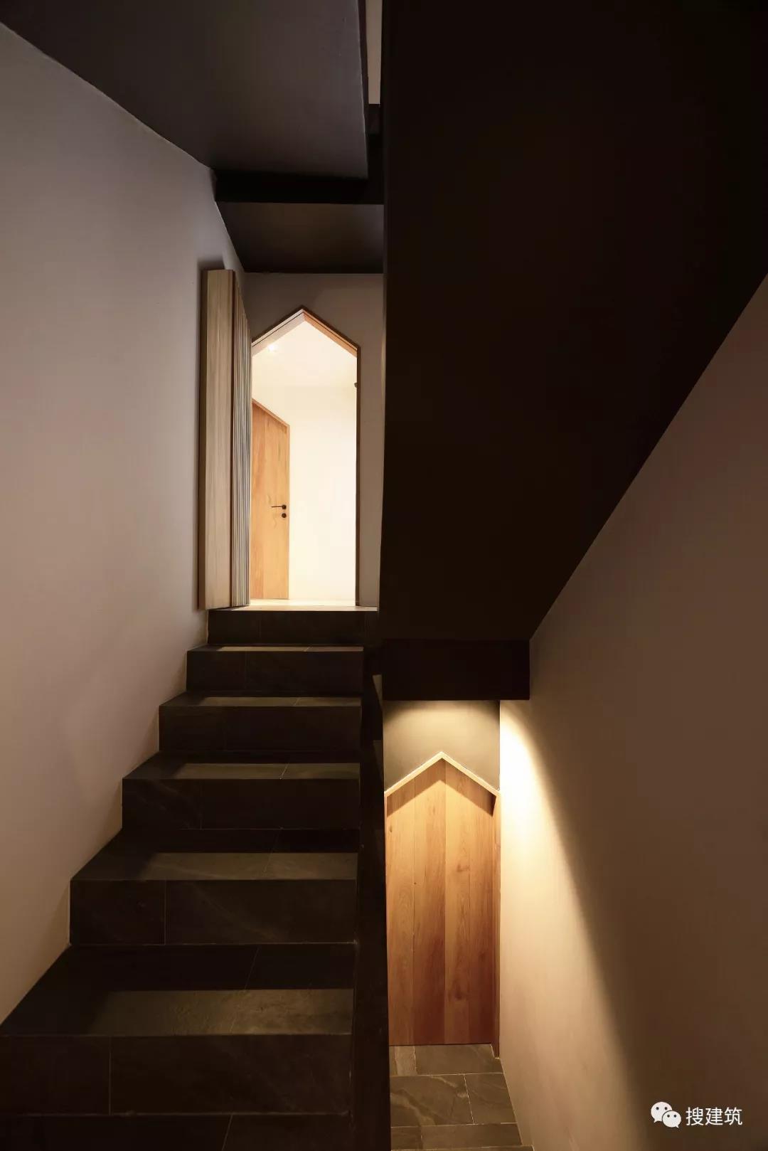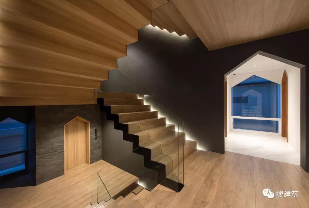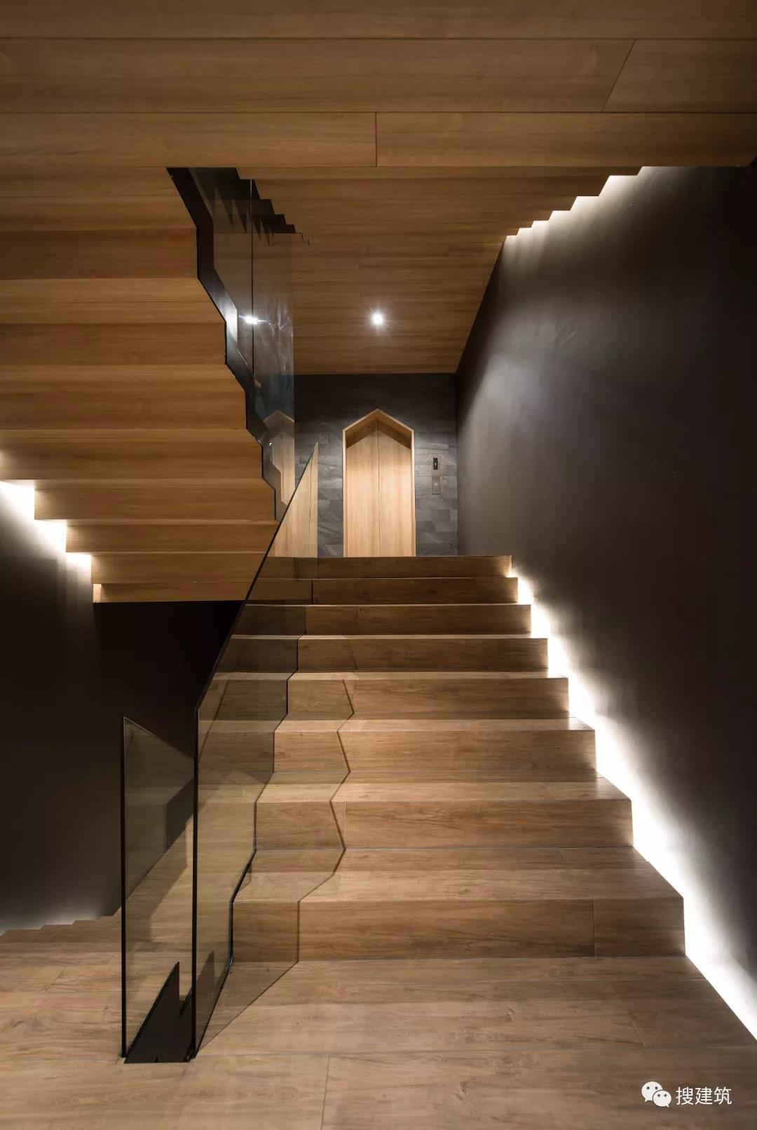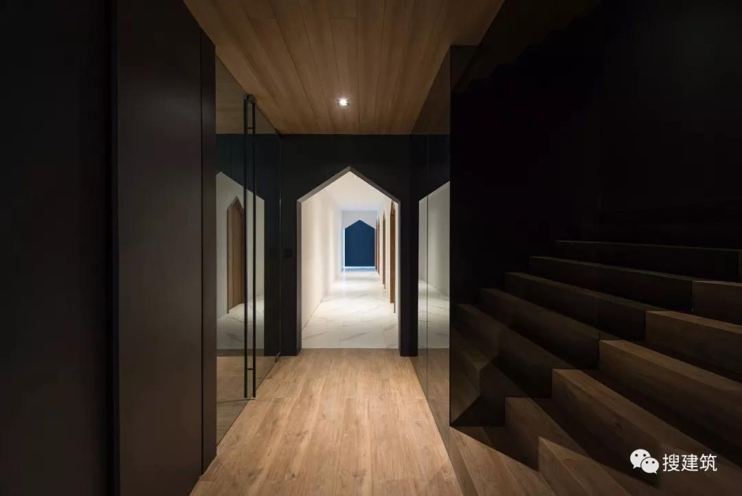 The corridor wall and stair hall are built by black stones, with tiny spot lights that emit toward wood floor to guide and draw people’s attention to the path while walking.