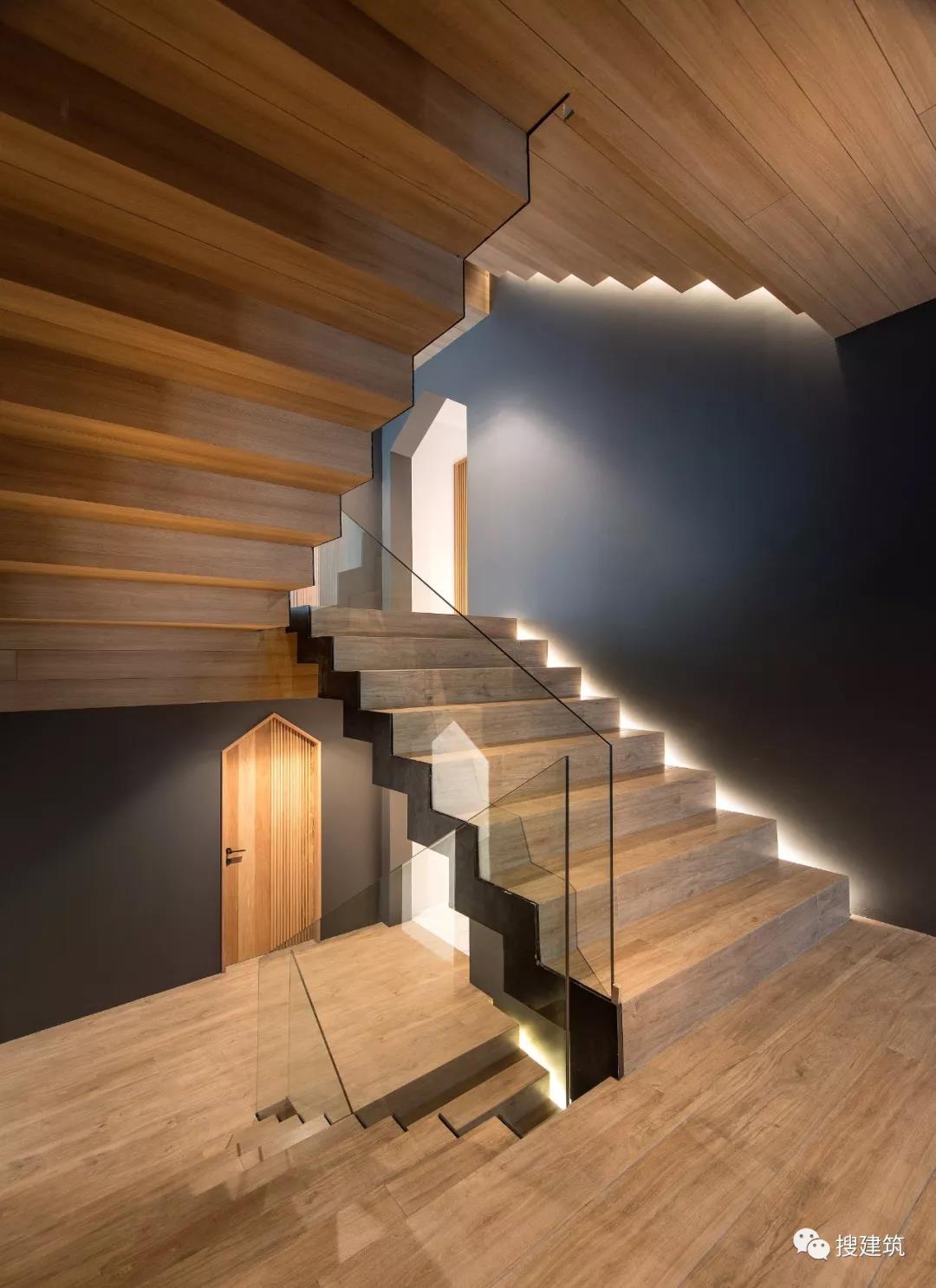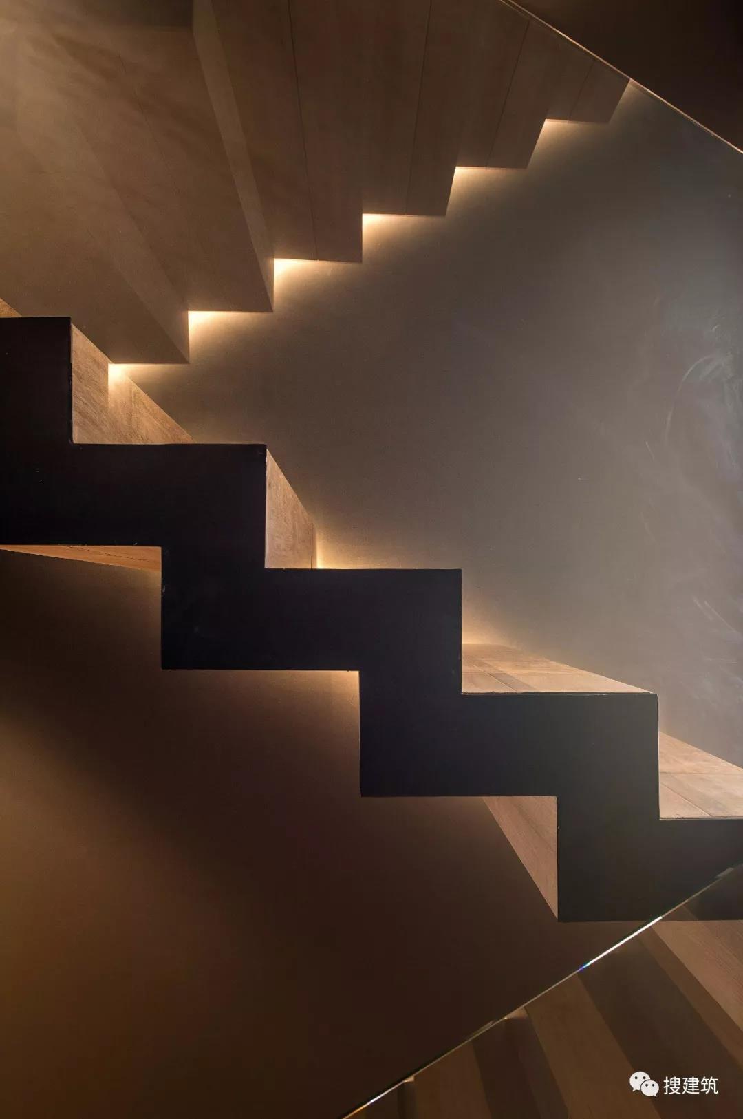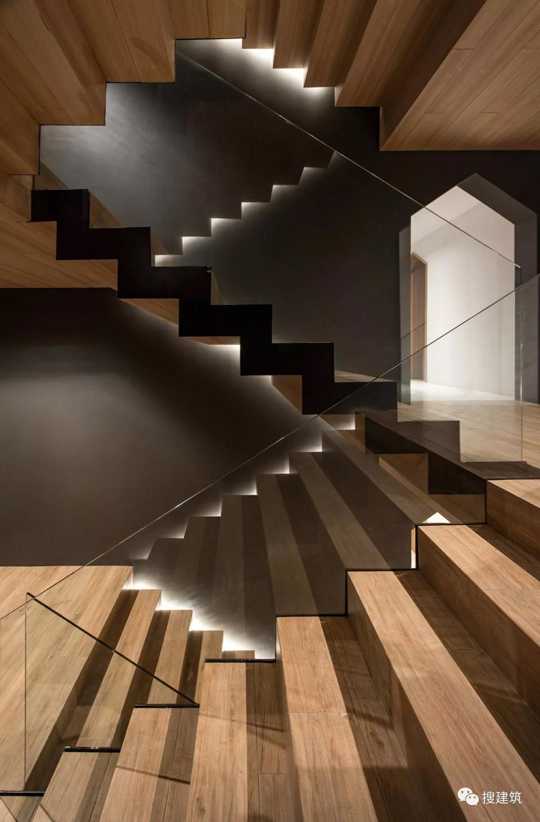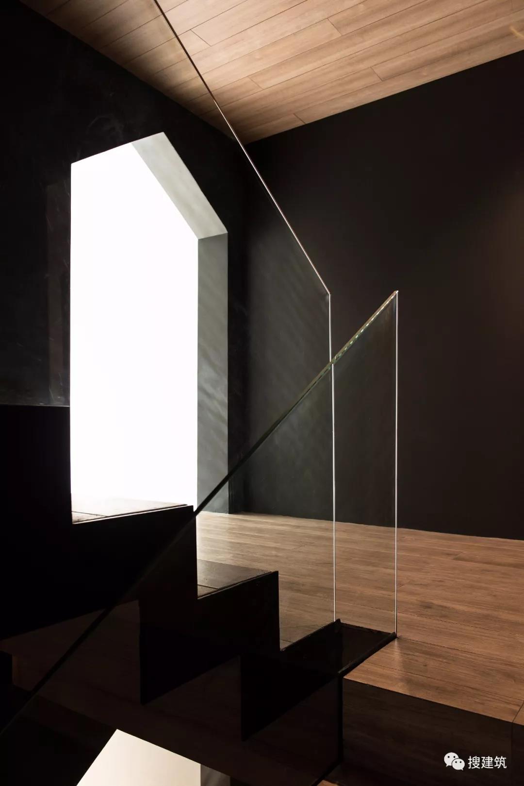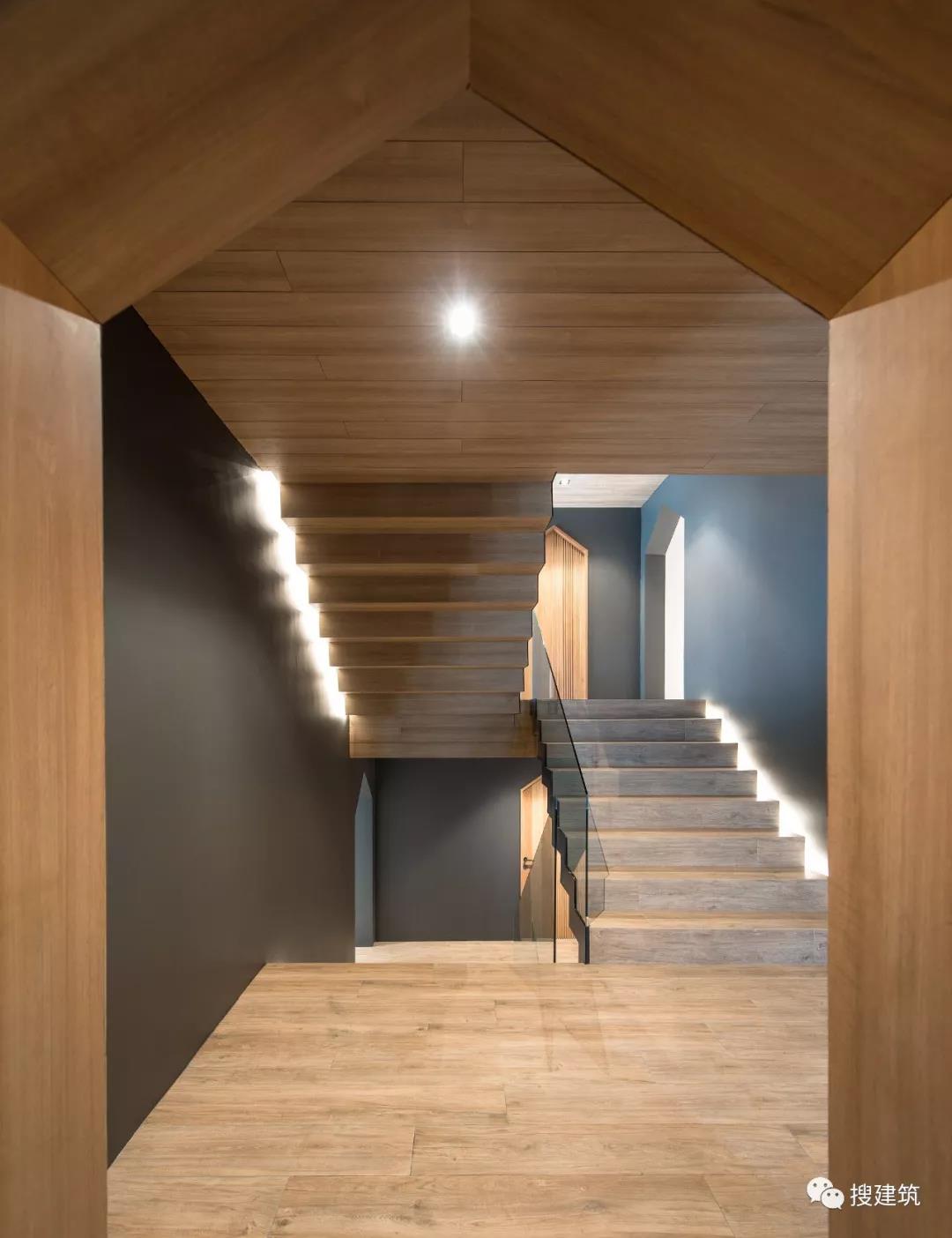The corridor wall and stair hall are built by black stones, with tiny spot lights that emit toward wood floor to guide and draw people’s attention to the path while walking.
