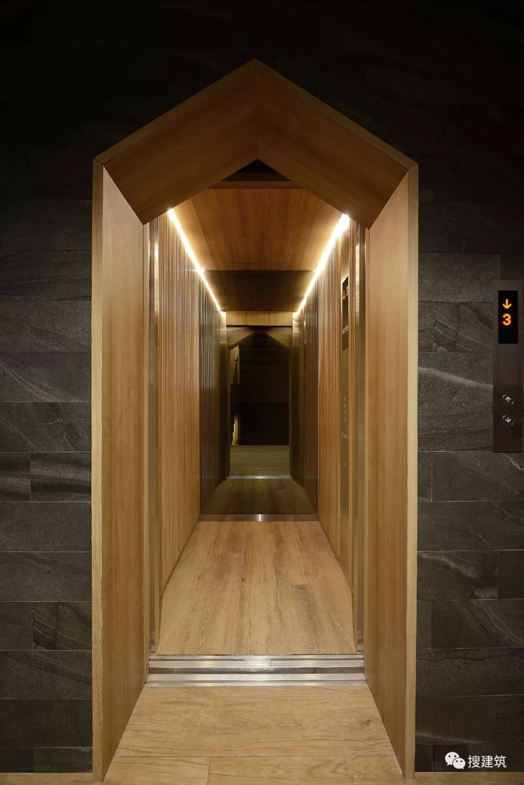 走廊的墻和樓梯大廳由黑色石頭建造,微小的聚光燈照射到木地板上,給租戶照明。