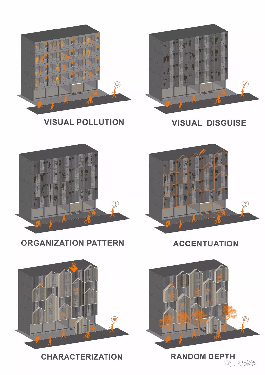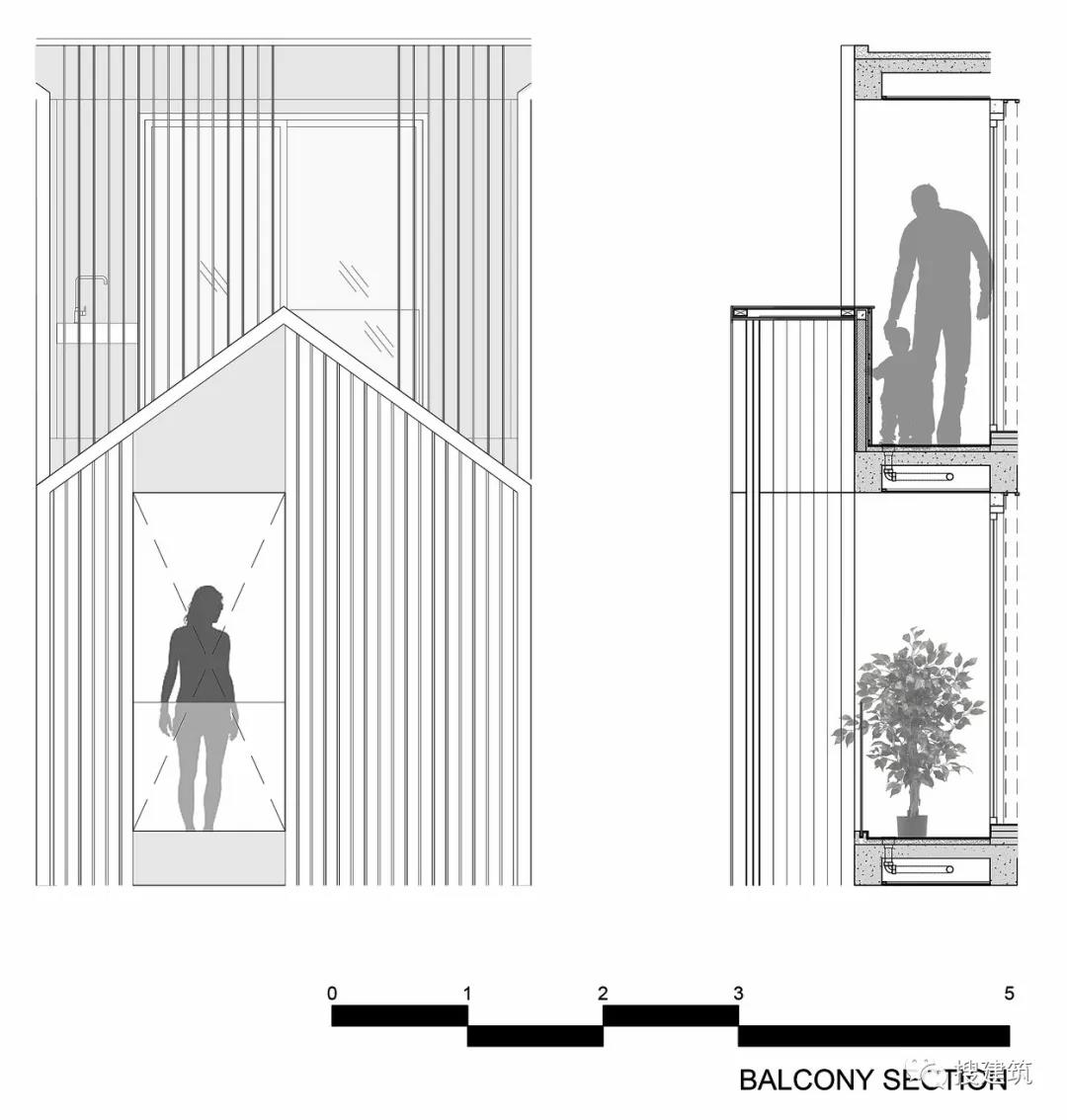 在傳統公寓的設計基礎上,創造了一個堅固的盒子作為模型,外部由幾個陽臺組成,這些陽臺主要目的就是用來晾衣服。在每個陽臺上設計山墻,隱藏不整潔的陽臺,并在白天成為遮陽傘,讓租戶感覺公寓就是他們的家。