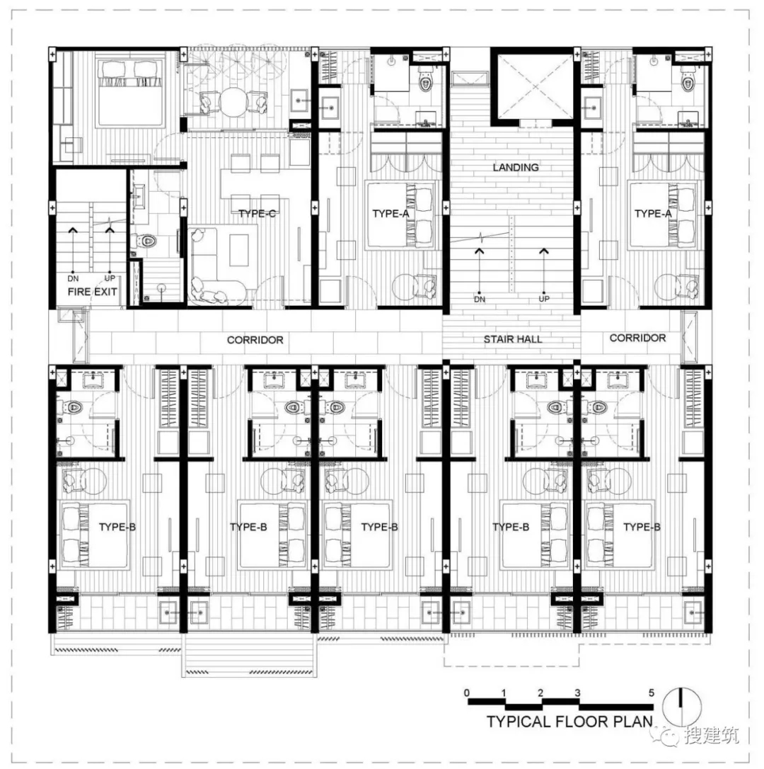 HACHI是一家現代服務月租制的公寓,位于曼谷Ladprao的商業區,周圍環繞著非常擁擠的城市住宅,辦公樓和傳統公寓。這家服務式公寓由34間豪華客房組成,面積為26-44平方米。每個房間都有辦公室和多功能廳。因此,該建筑將擴建到5層,總建筑面積為1,100平方米。