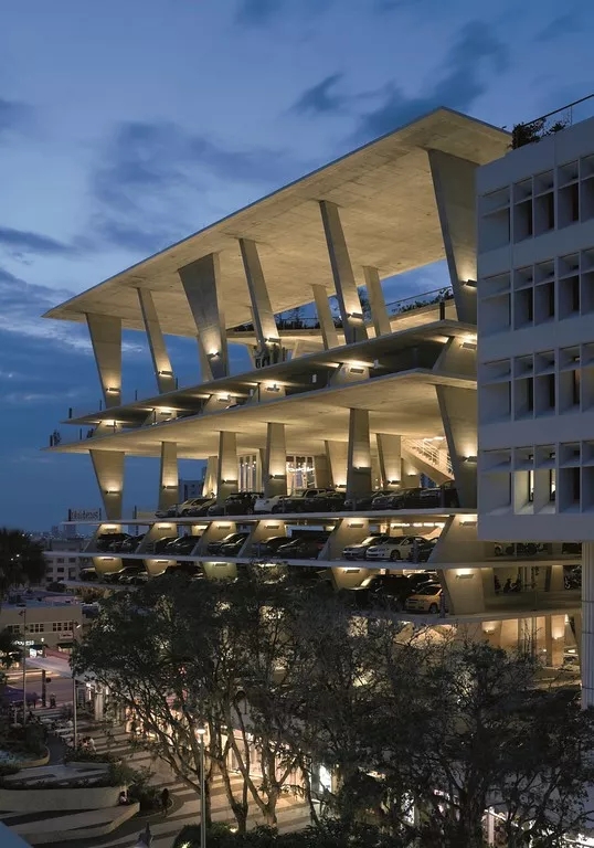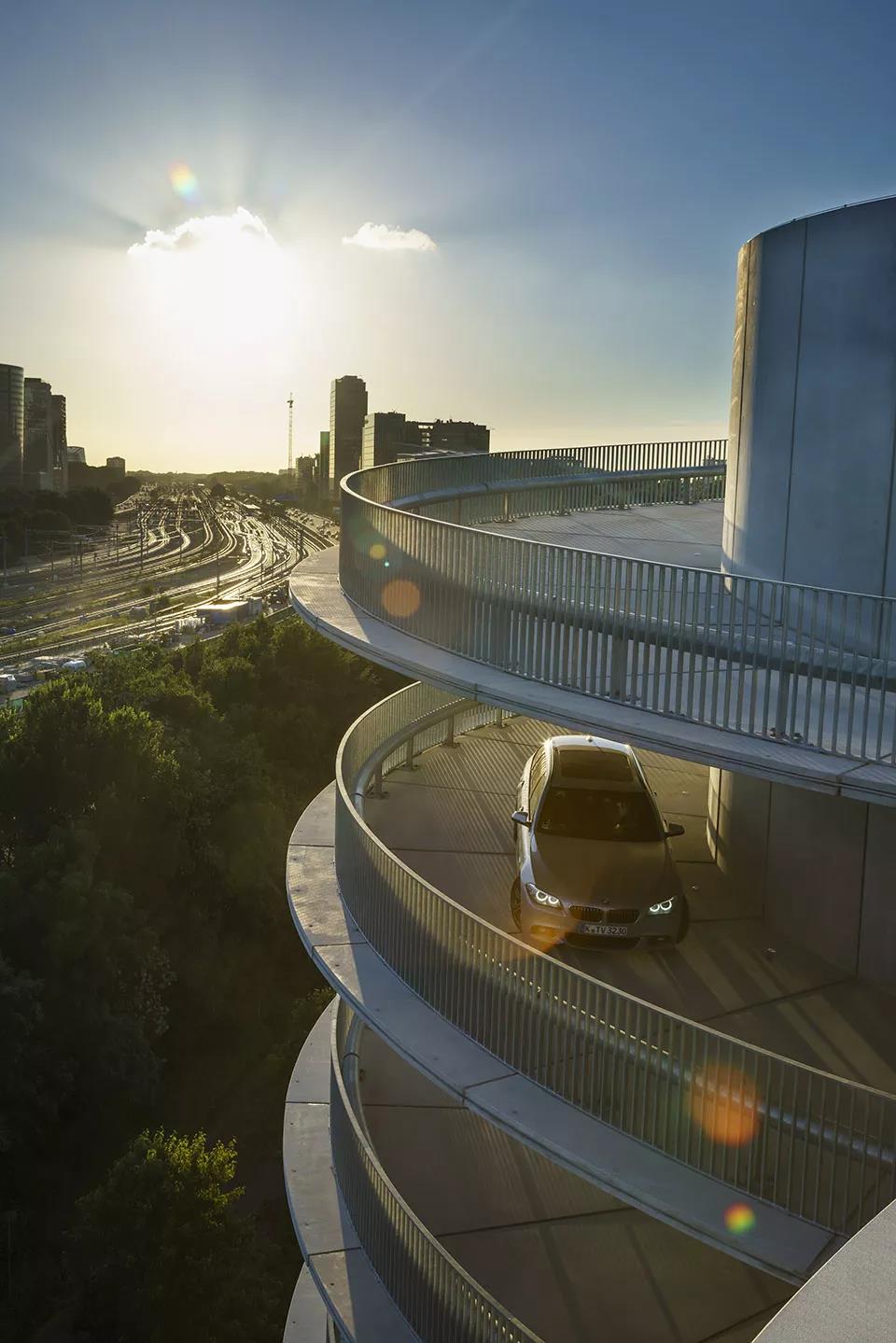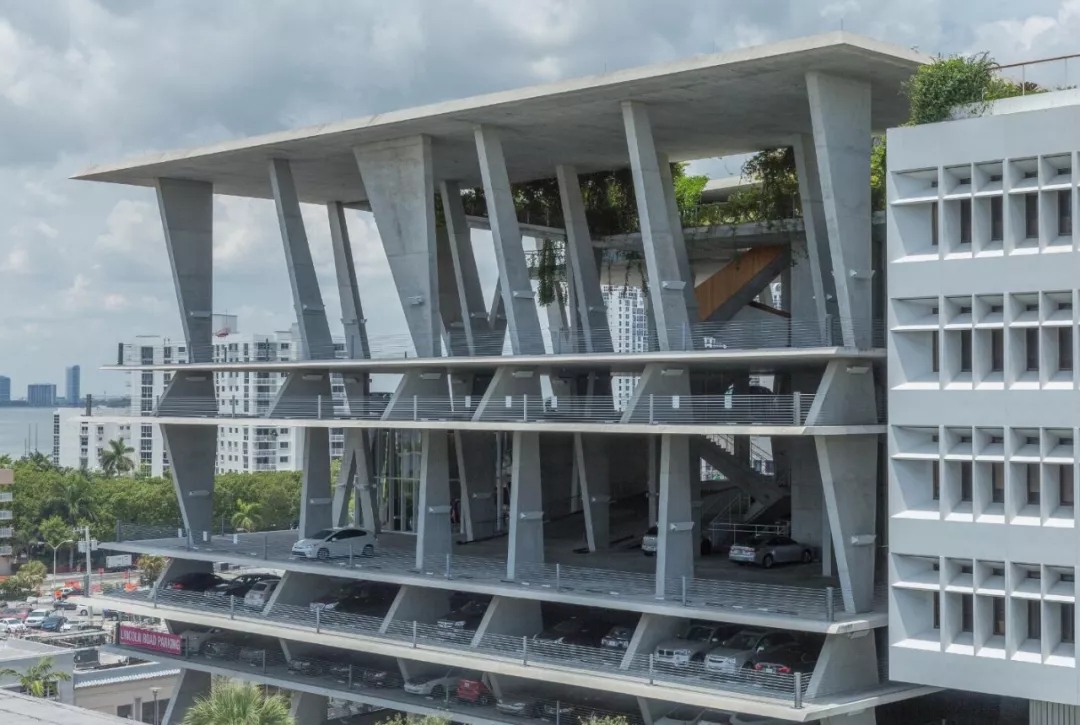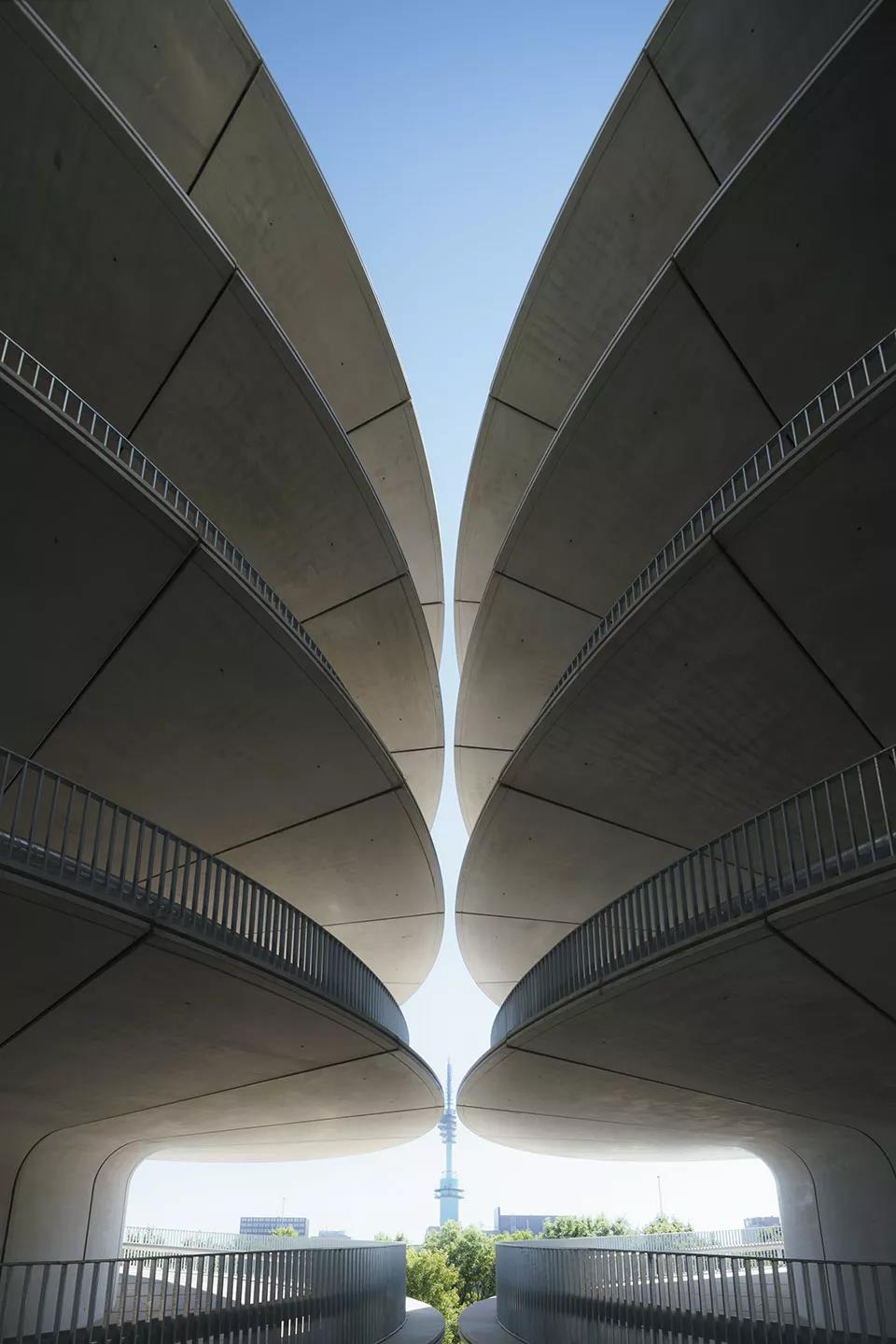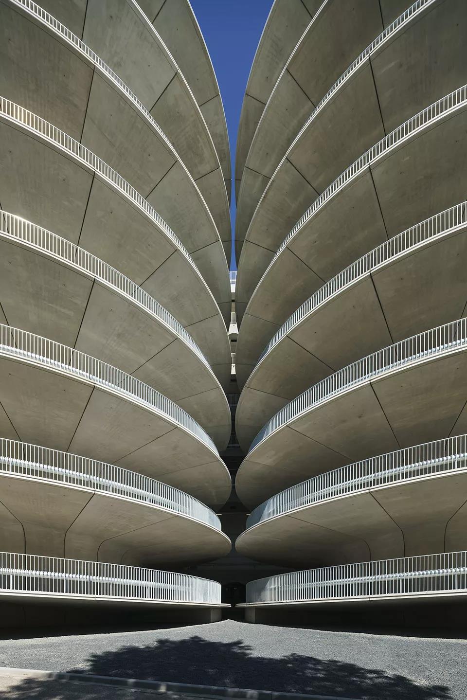 巨大的預制混凝土構(gòu)件將螺旋塔樓與主體停車場相連接