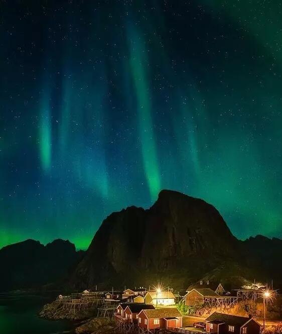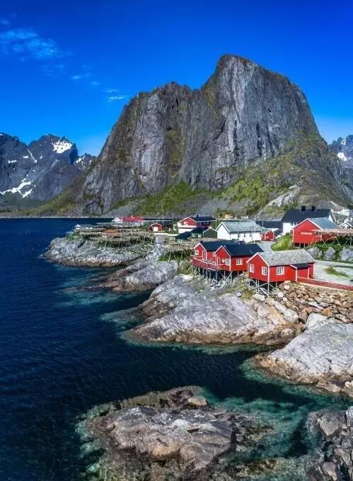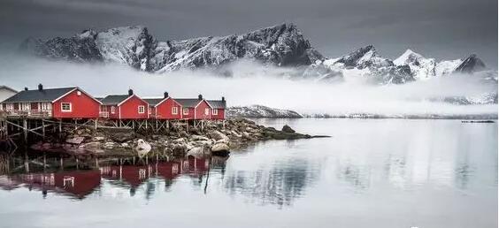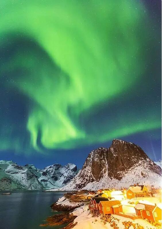 Hamnoy小鎮位于挪威沿海,小鎮上的房子多用紅色漆木,與挪威寒冷的冬天形成鮮明的對比。
