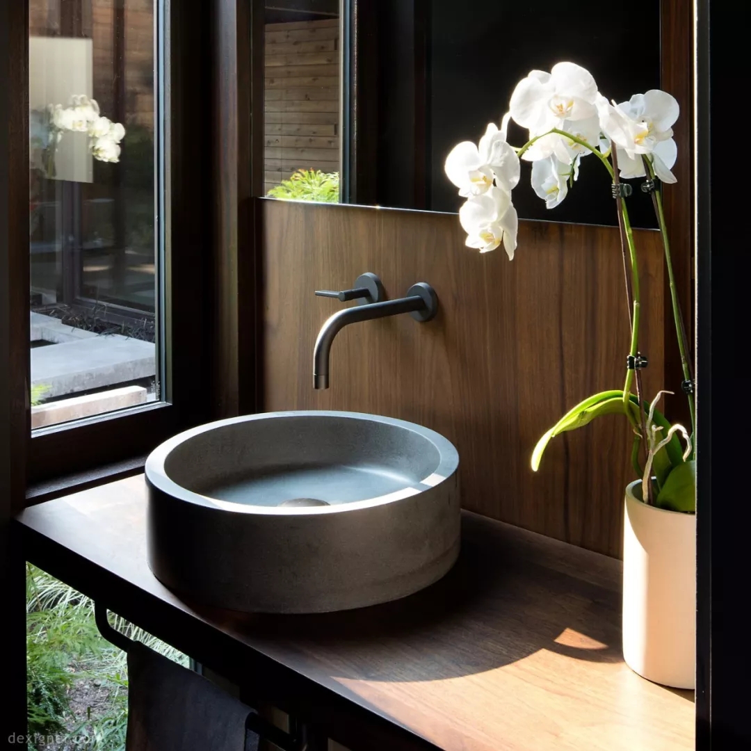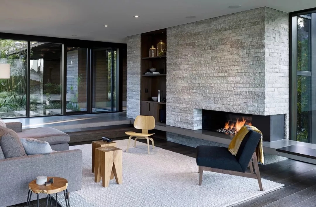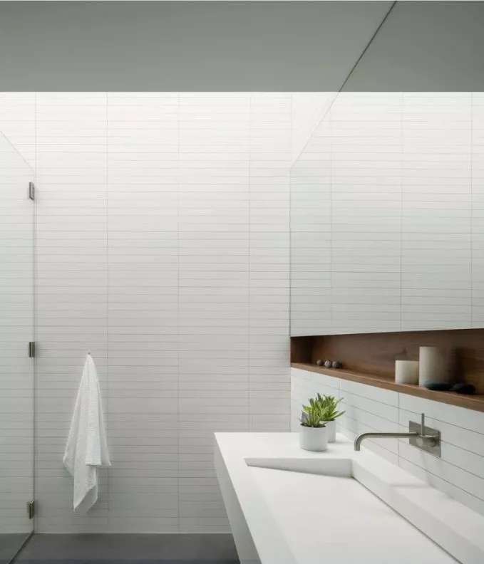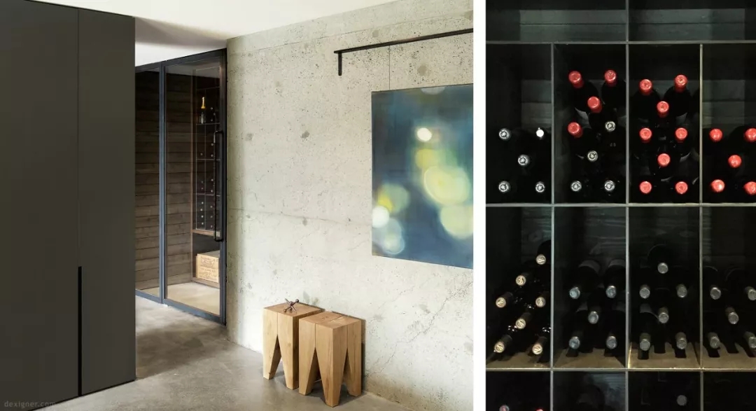 漂浮木地板垂直于一系列深色木條板和混凝土,現(xiàn)代簡(jiǎn)約的設(shè)計(jì)將材質(zhì)和工藝融為一體。