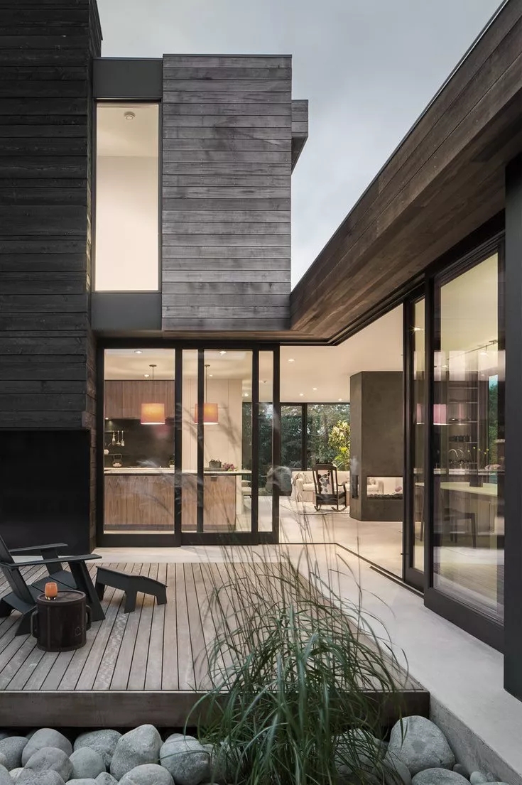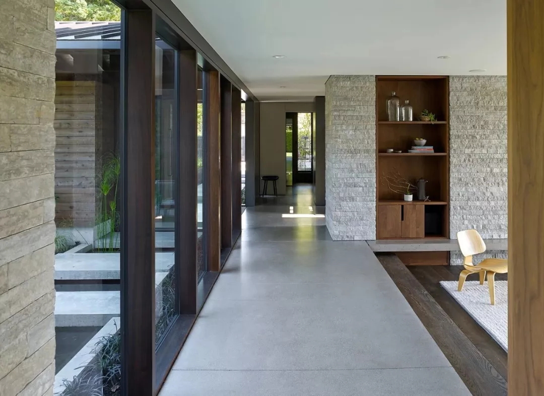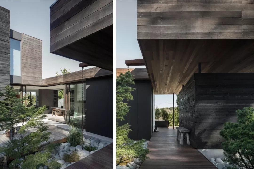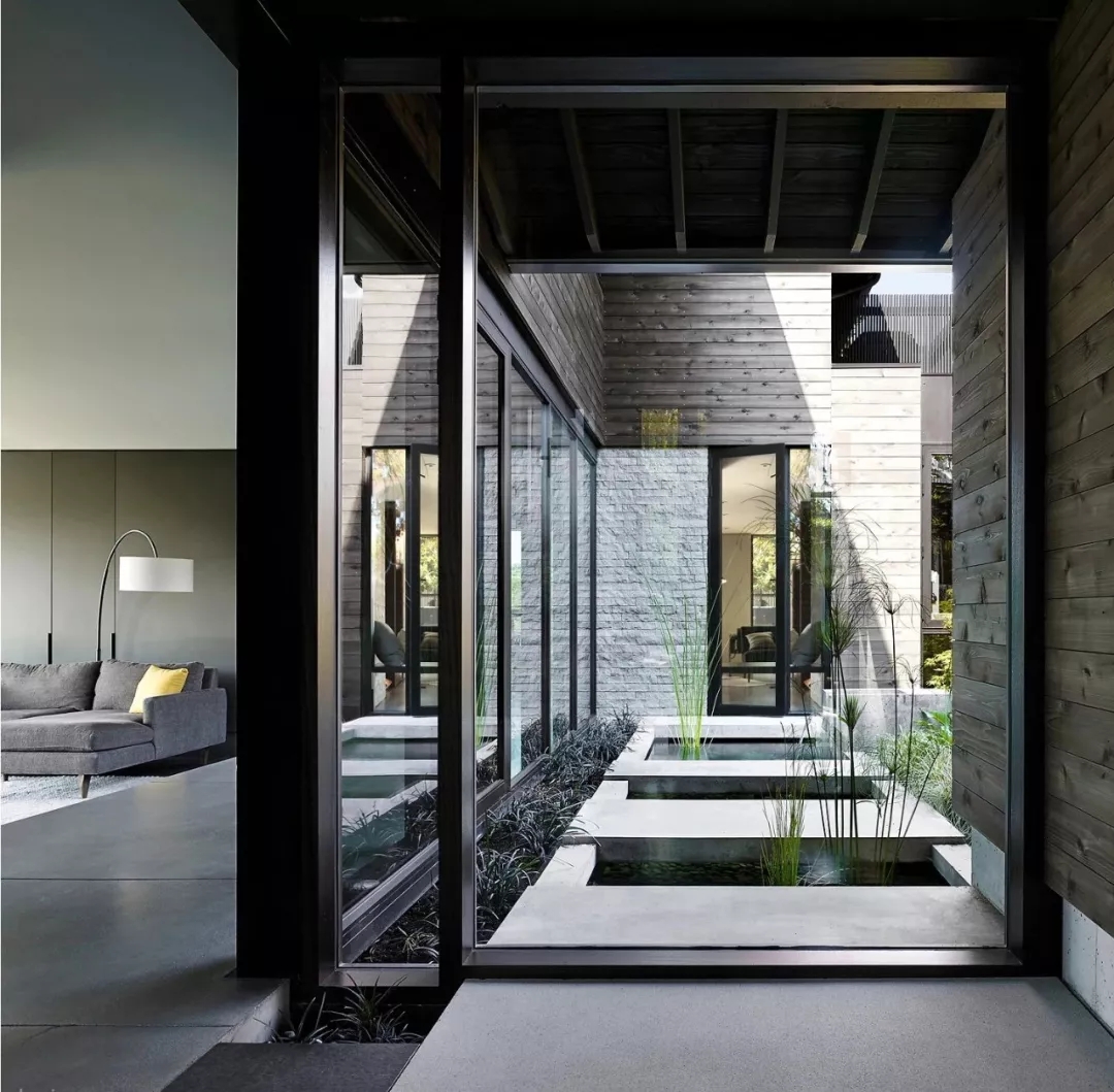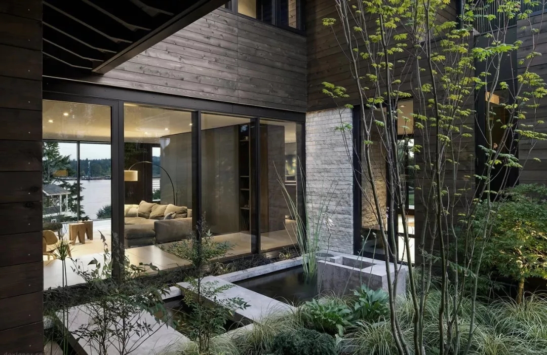 一個(gè)與景觀結(jié)合的安靜設(shè)計(jì),可以在家中創(chuàng)造一種切實(shí)的平靜。住宅中心的庭院帶來(lái)了寧?kù)o的私人戶外空間。