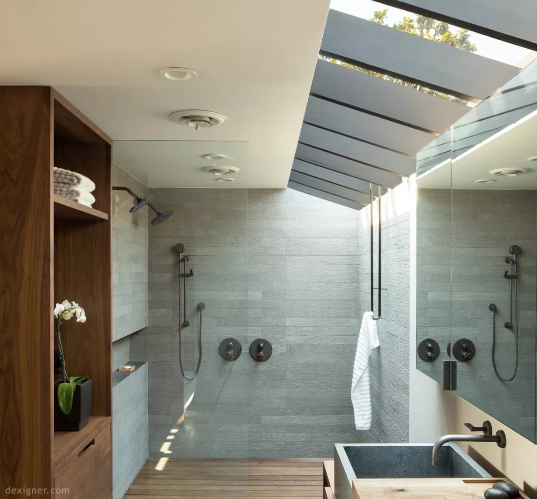 寬闊的平屋頂高高聳立在居住空間之上,營(yíng)造出一種人在戶外坐在樹(shù)叢中到感覺(jué)。精心布置的臥室以及浴室的位置,為屋主提供在森林中沐浴的儀式感。