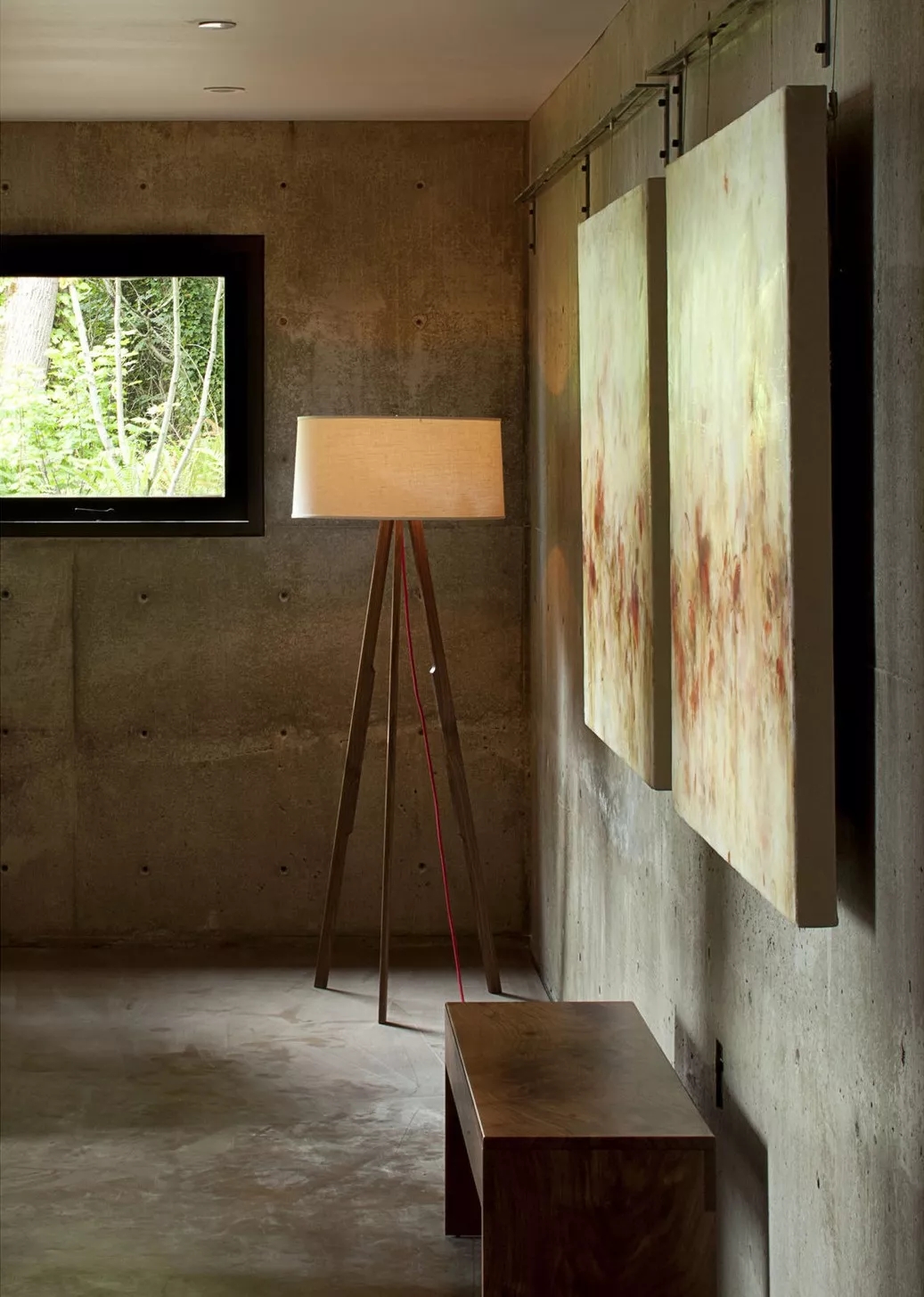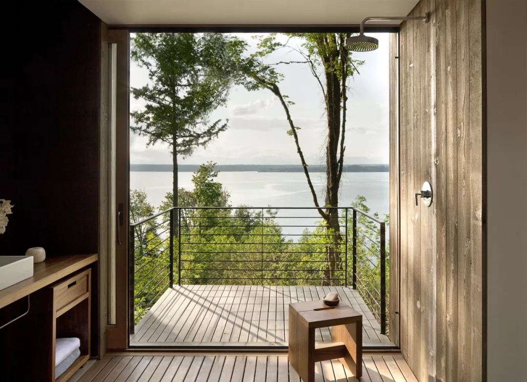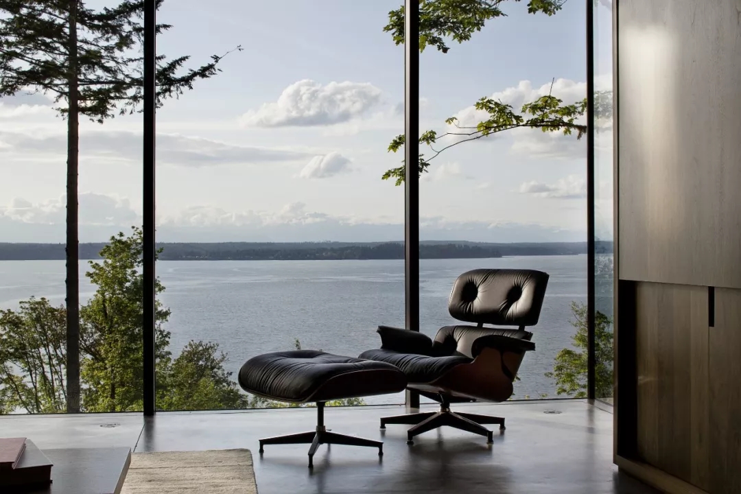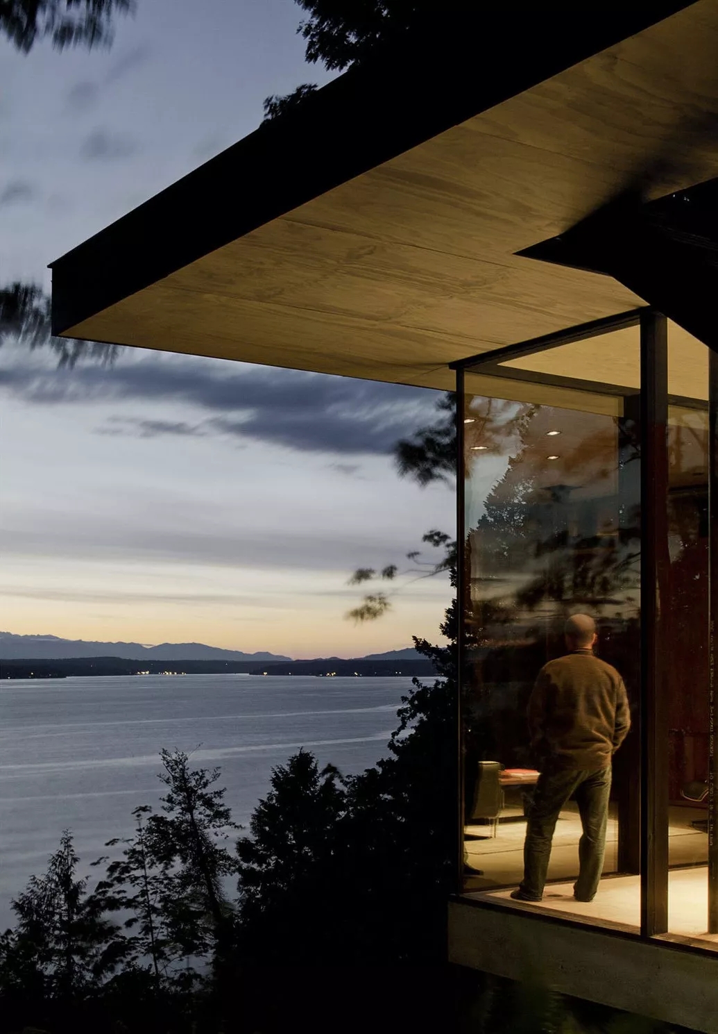 這個(gè)小型度假屋坐落在美國(guó)華盛頓州Case Inlet東部的山坡上,可以欣賞到奧林匹克山脈和普吉特海灣的景色,設(shè)計(jì)師用一個(gè)大膽的混凝土懸臂結(jié)構(gòu)將房子錨固咋森林中。