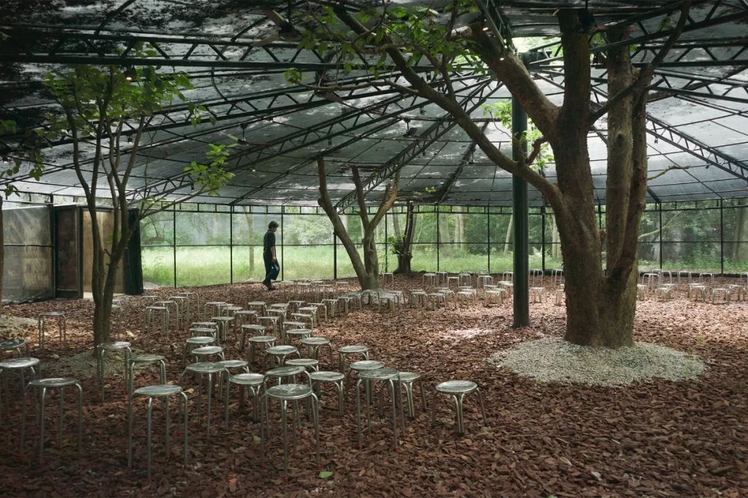 在棚上面做好開口,讓原本在這里的樹木自由地生長出去。劇場的凳子就是臺灣街邊面館最常見的坐凳。
