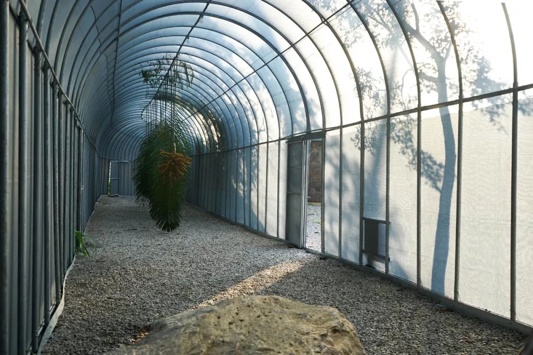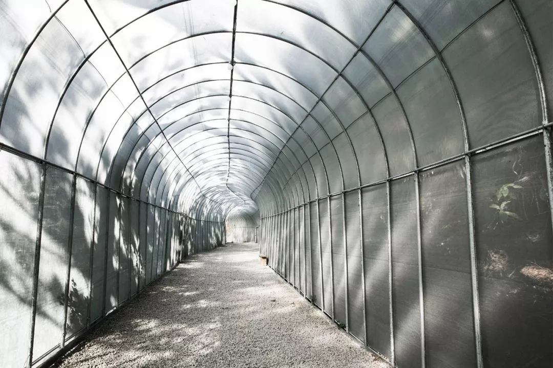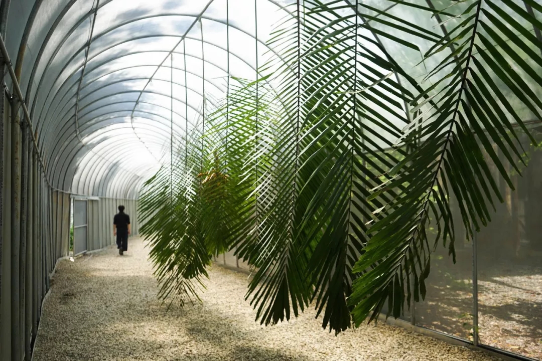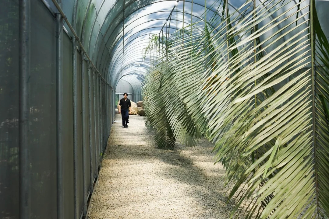 300公尺長的大棚就像一個大型蚊帳,材料是臺灣最常見的育苗棚,能夠保護人不受大自然的侵擾。