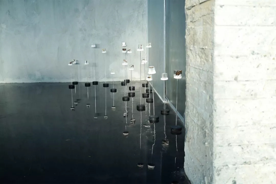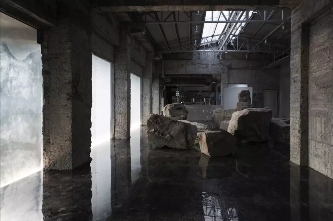 地板希望呈現溪流的樣子,在水族館老地板上面覆蓋一層半透明的黑樹脂,并且在入口不規則地漫出來,像溪水自然流淌。