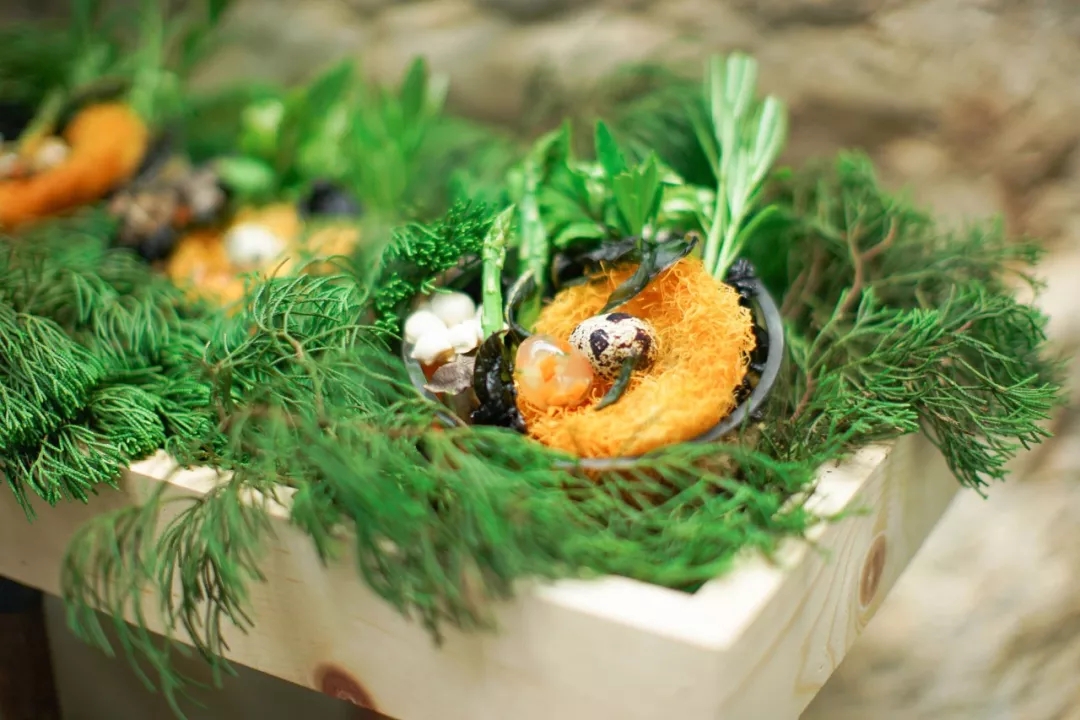 河流最上游是高山,用了高山上面采集的甜甘菊,煮汁做成露珠的樣子。到了中游,會產生的一些果蔬,做了水果和花草的料理。到下游是肥沃的沖擊土,是淀粉類的料理。
