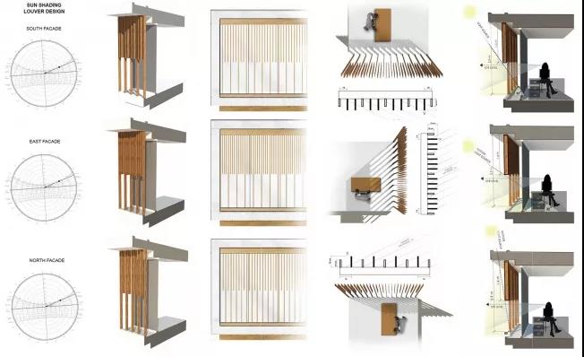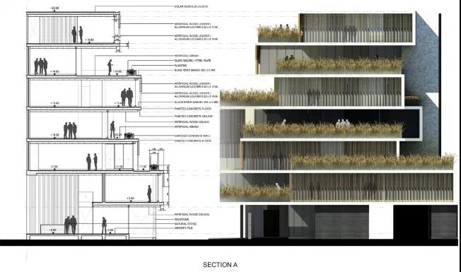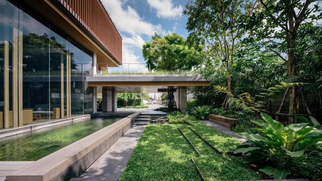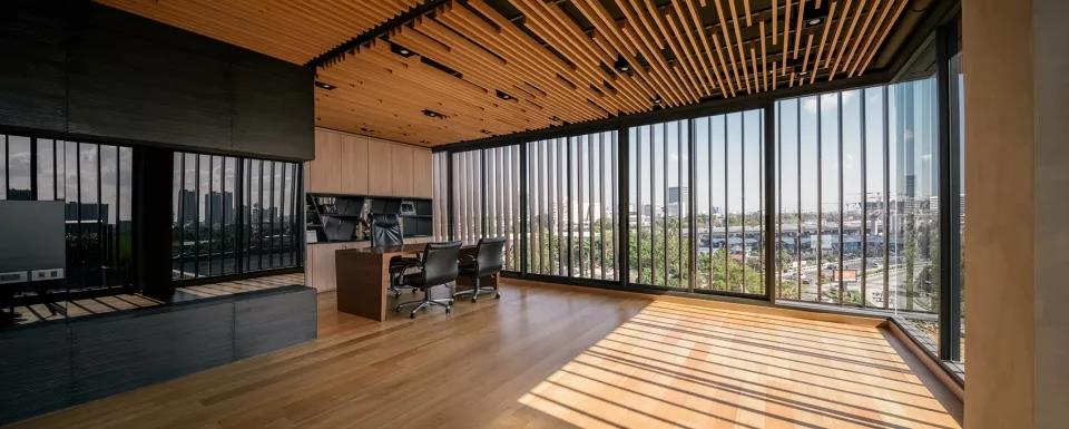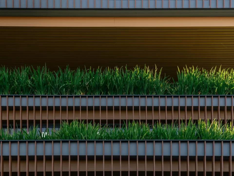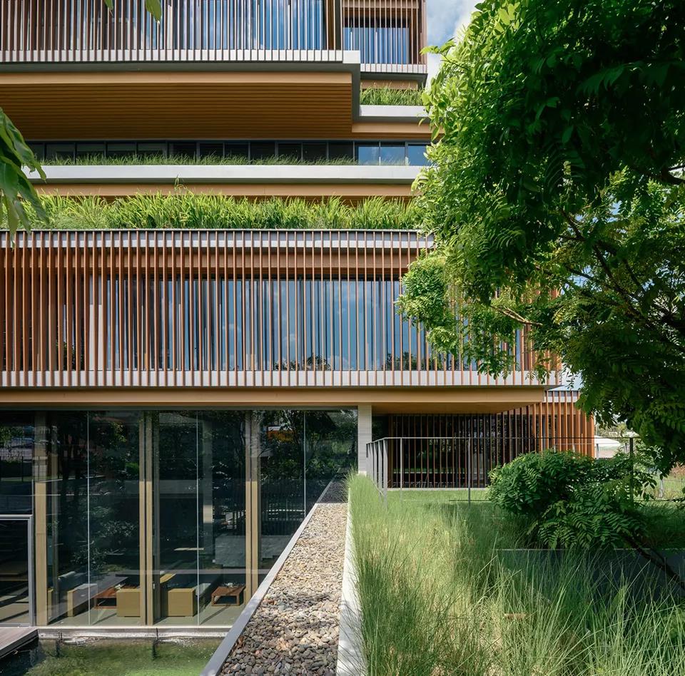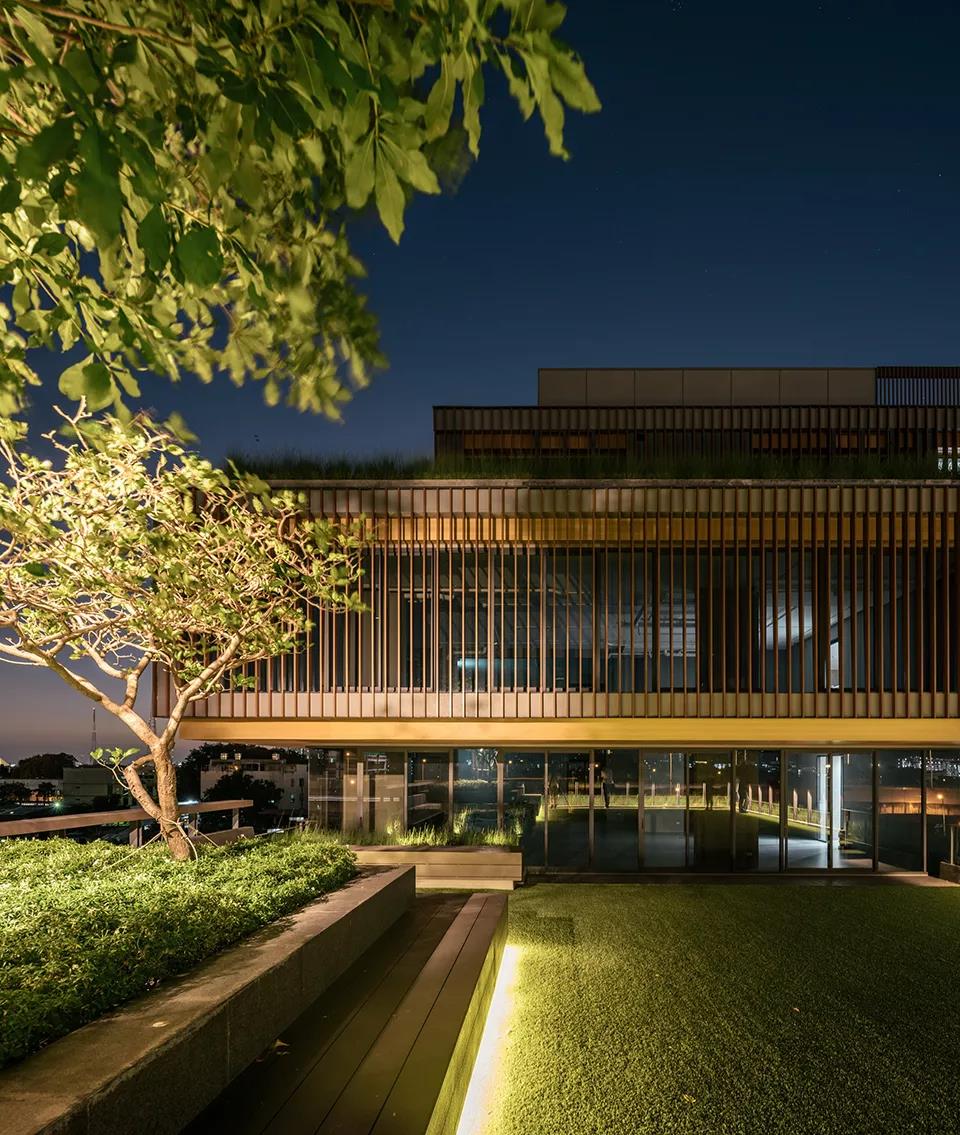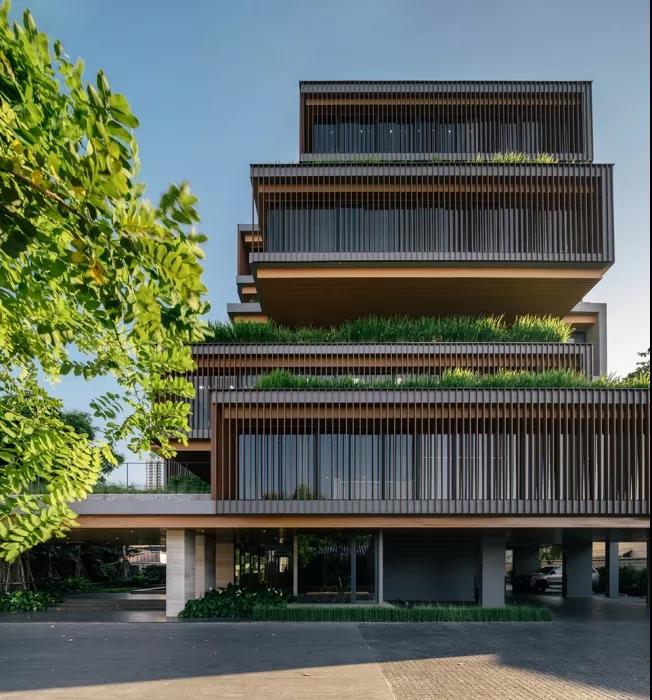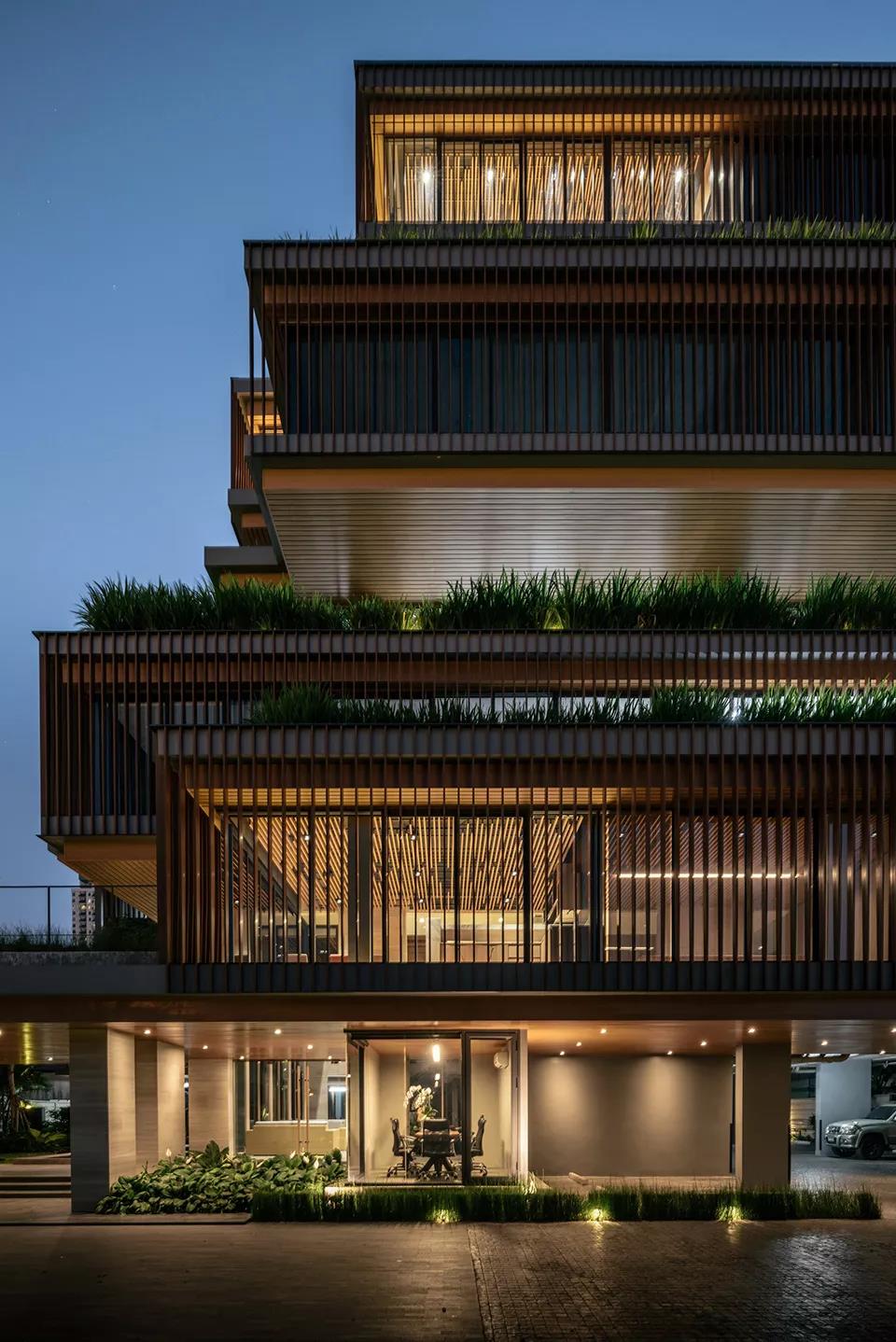 整個項目不光滿足了辦公功能需要,同時設計師還根據泰國的熱帶氣候制定了一套環境策略。一個由鋁制垂直翼片構成的特色的立面成為了外部和內部之間的多重媒介。通過計算太陽角度及其運行軌道后,每個翼片將會跟隨各個方向上的太陽光線而改變,這樣的設計既可以作為遮陽設備,還可以作為自然通風的通道,同時為住宅的提供更多隱私性。這些垂直板條有助于過濾掉太陽光所帶來的多余熱量,從而減少對空調的依賴。每層樓的“水稻梯田”也有助于緩解建筑物的制冷負荷,以完全自然的方式抵御熱量的吸收,營造出建筑物特有的微氣候,中和可能出現的不平衡氣候。