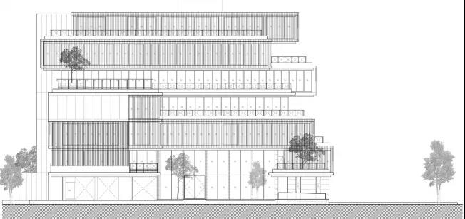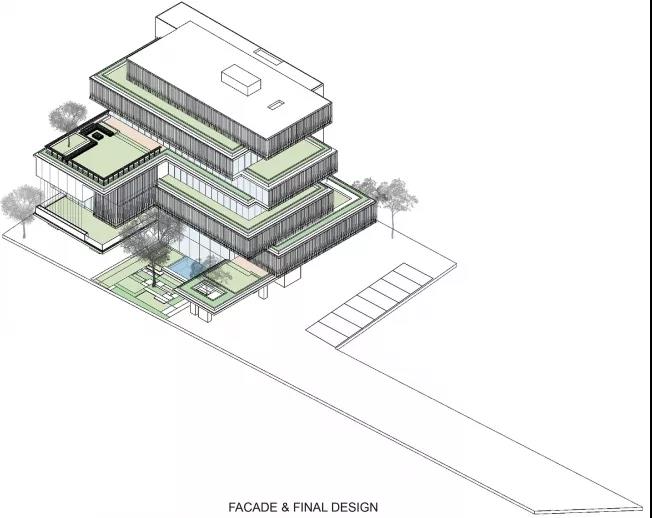 由于各種場地限制,如地界、高度限制和不規則的場地邊界,同時為了滿足公司的辦公要求,設計師認為該建筑必須展現高效這一概念,每個樓層的體量都被改造為略微不同的形式,由此形成了一系列重疊的懸挑露臺結構。 簡潔的堆疊式露臺也將室外的動植物景觀滲透到建筑內部的多個功能區域中。