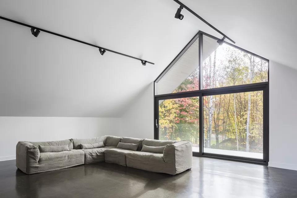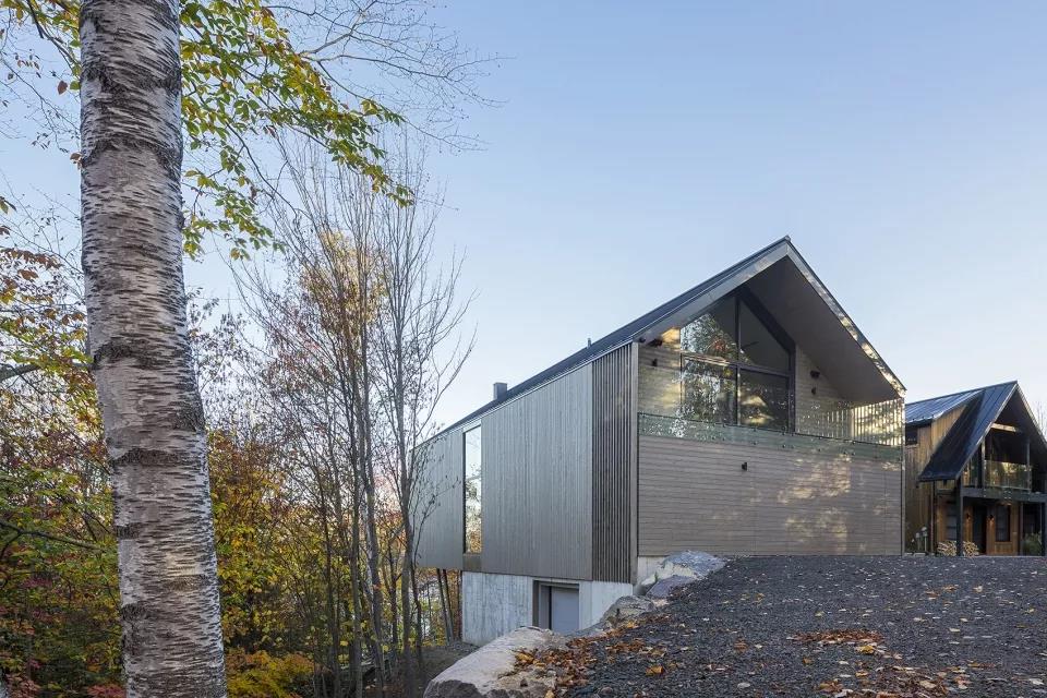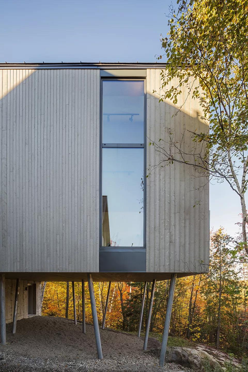 該項目位于魁北克省Laurentians的一個群山環繞的鄉村區域,凌駕在上方。簡約的木制體量使其從周圍綠色的山景中脫穎而出。