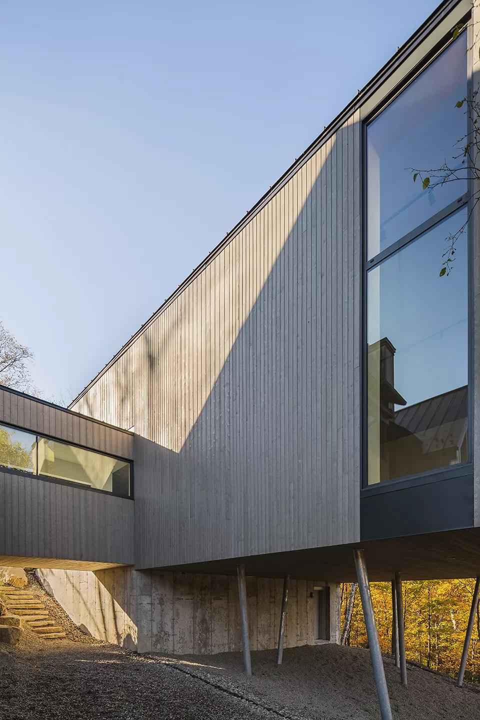 建筑整體呈現為一個被灰色做舊木材包覆著的簡單體量。厚實的外墻采用了被動式房屋的建筑標準。從另一個角度來看,復雜的細部結構在墻壁和屋頂之間實現了通風,并將車庫大門完全隱藏起來,墻內的保溫層則能夠應對魁北克冬季的極端天氣。