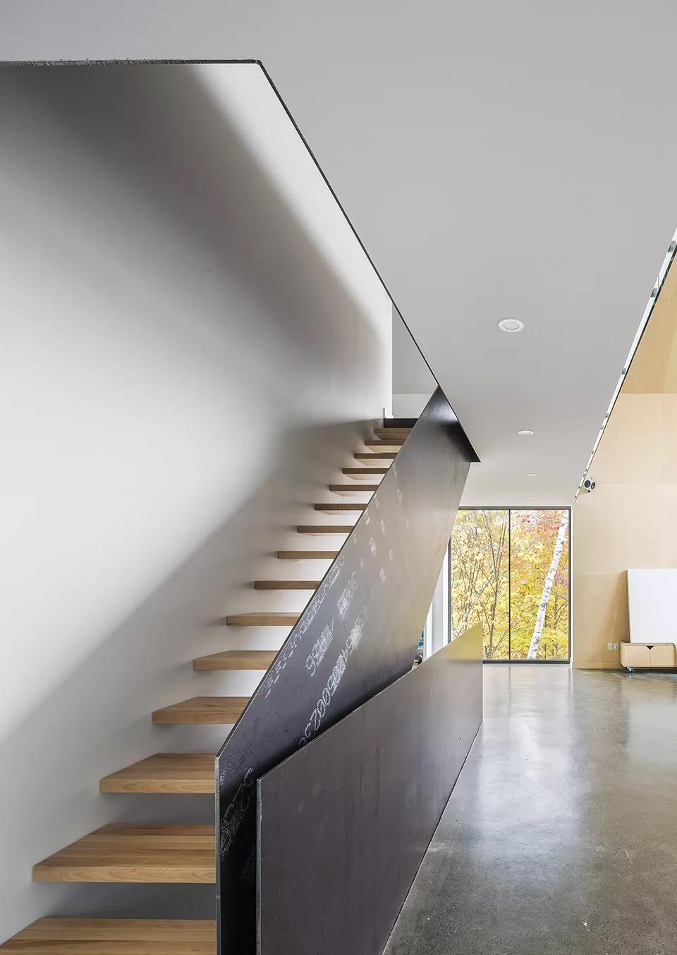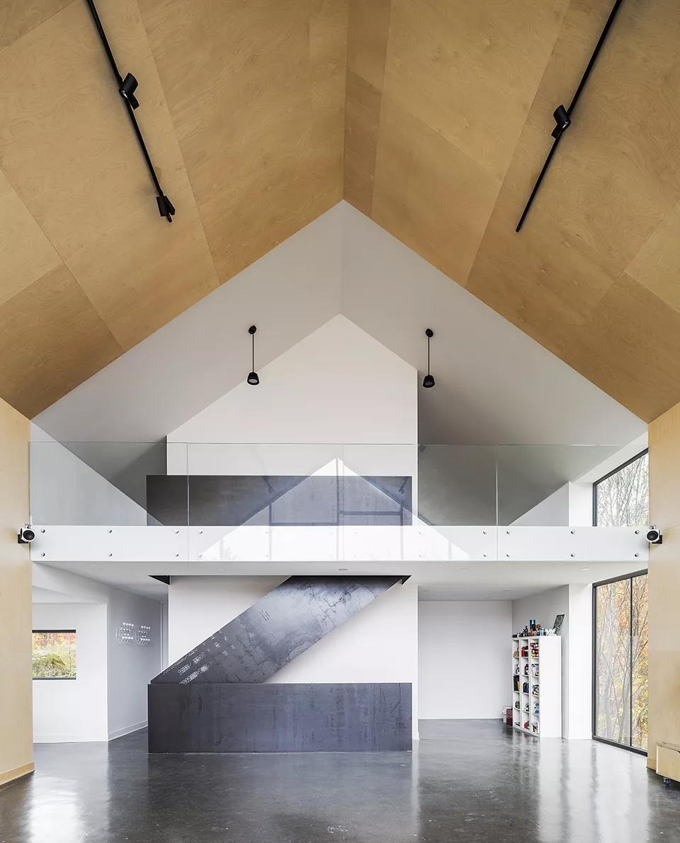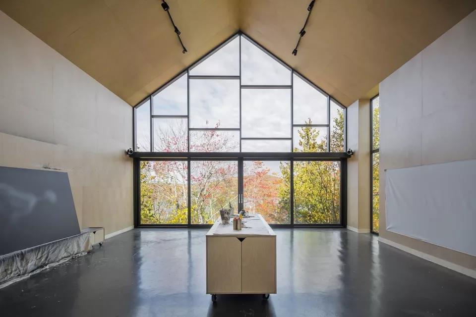 工作室的窗戶朝向北方,可以欣賞到湖泊的美景。其室內空間寬敞而不失溫馨感,同時提供了容納大尺寸畫作的空間。極簡主義的室內立面和方正的布局為藝術家的作品提供了背景,并且有助于注意力的集中。
