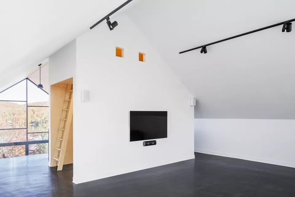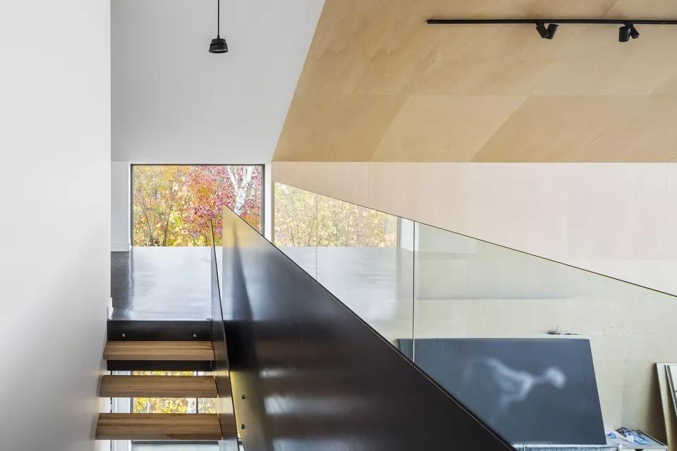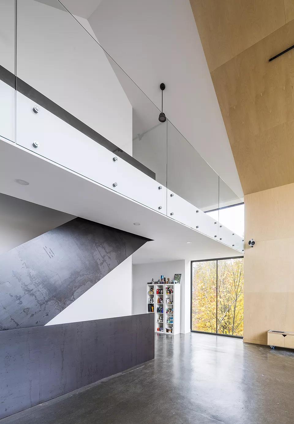 建筑的外觀使人聯想到傳統的谷倉,從懸崖邊伸出的體量凌駕于湖面之上。這座建筑占地超過5000平方英尺,包含一個雙車位的車庫、一間工作室、一間寬敞的創作室以及一個夾層。