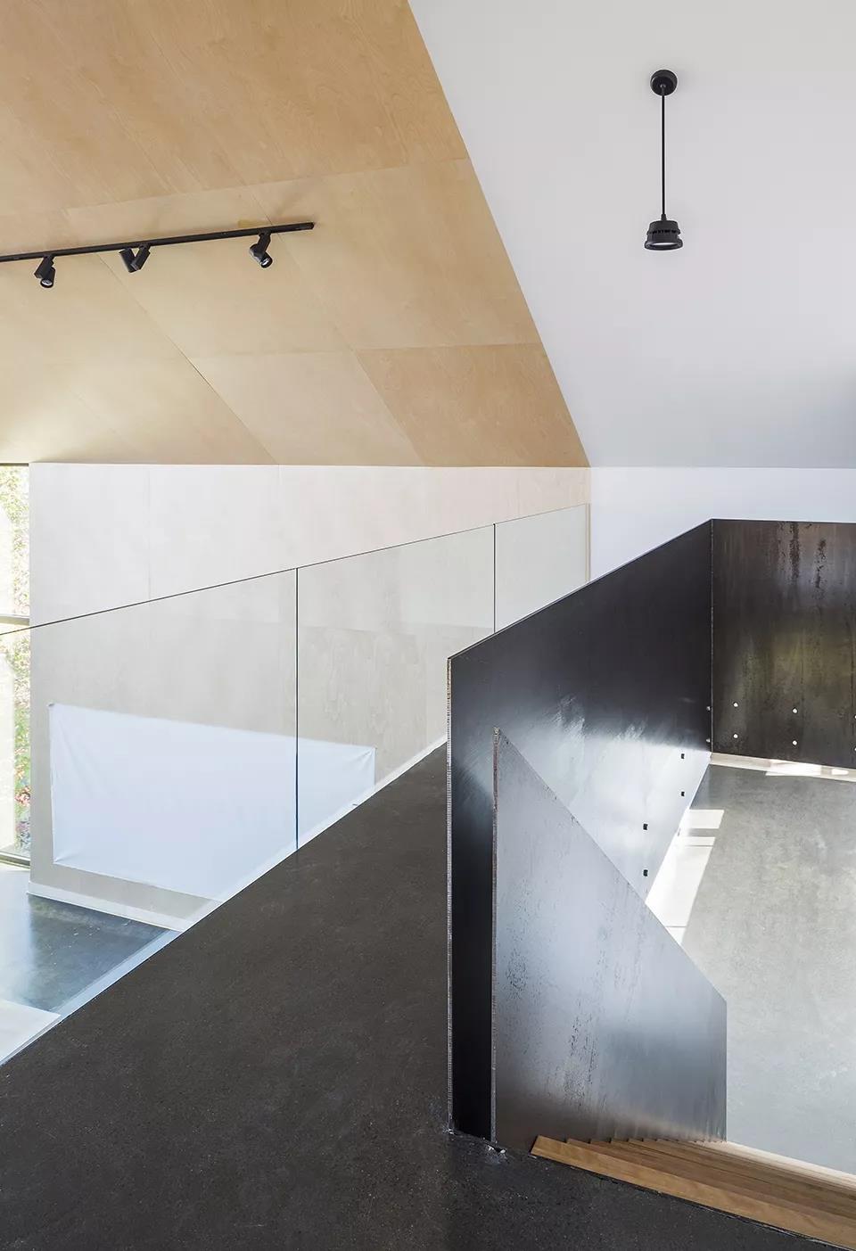 位于寬闊天花板下方的夾層空間包含了休閑區和游戲區,其中間還設有一個小房子,容納了一間浴室。另外在更高處還設有一個更小的夾層,是孩子們理想的藏身之所。在這座居高臨下的平臺上,拋光的混凝土地面反射出周圍的場景,增加了一種眩暈的感覺。該區域可以通過介于橋梁和夾層之間的開放式樓梯進入。由大型冷軋鋼板構成的樓梯側面展示了藝術家在畫布上揮出第一筆的姿態。