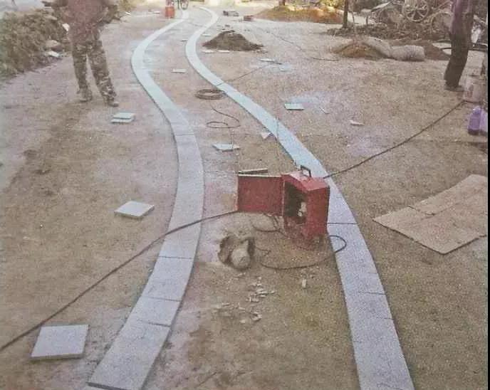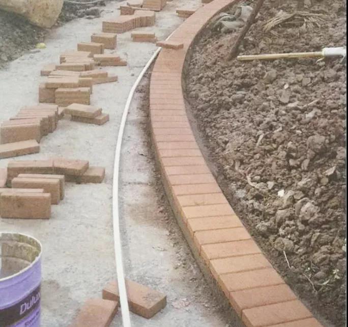 弧形園路在放線時可以利用柔韌性較強的PVC管彎曲成自然弧形作為園路走向的參考線,具體位置可以結(jié)合圖紙和現(xiàn)場實際情況進行微調(diào),以保證園路線條流暢(推薦使用?25mm管徑),遇道路交叉口的弧線段,收邊材料注意應按照現(xiàn)場弧度進行二次加工。