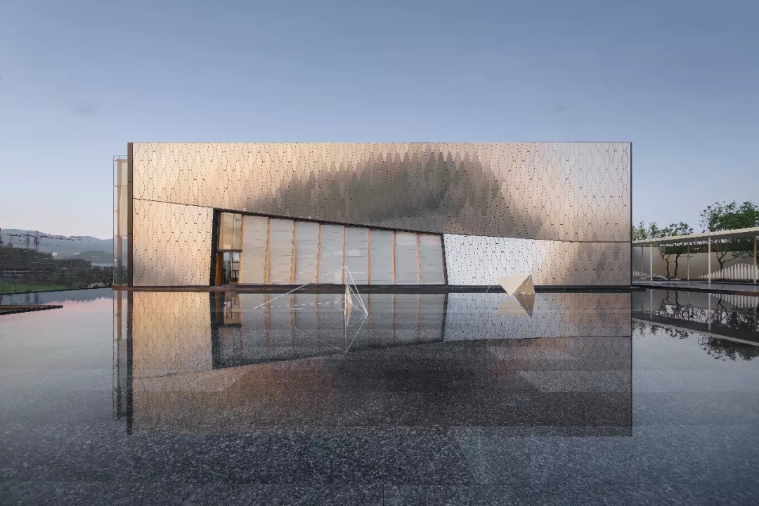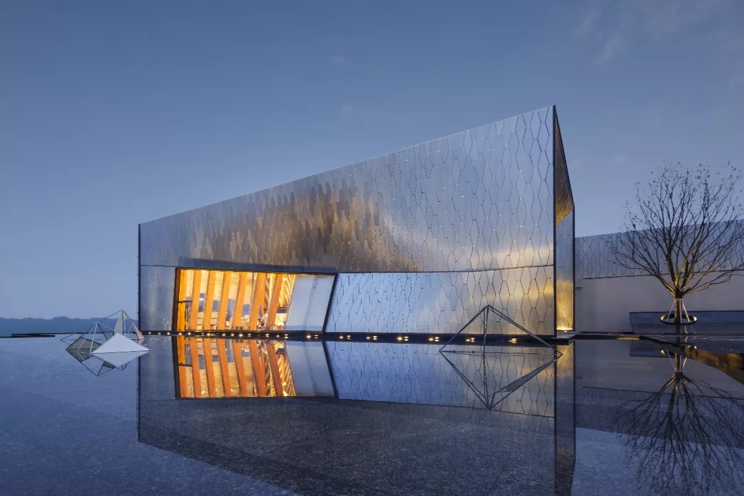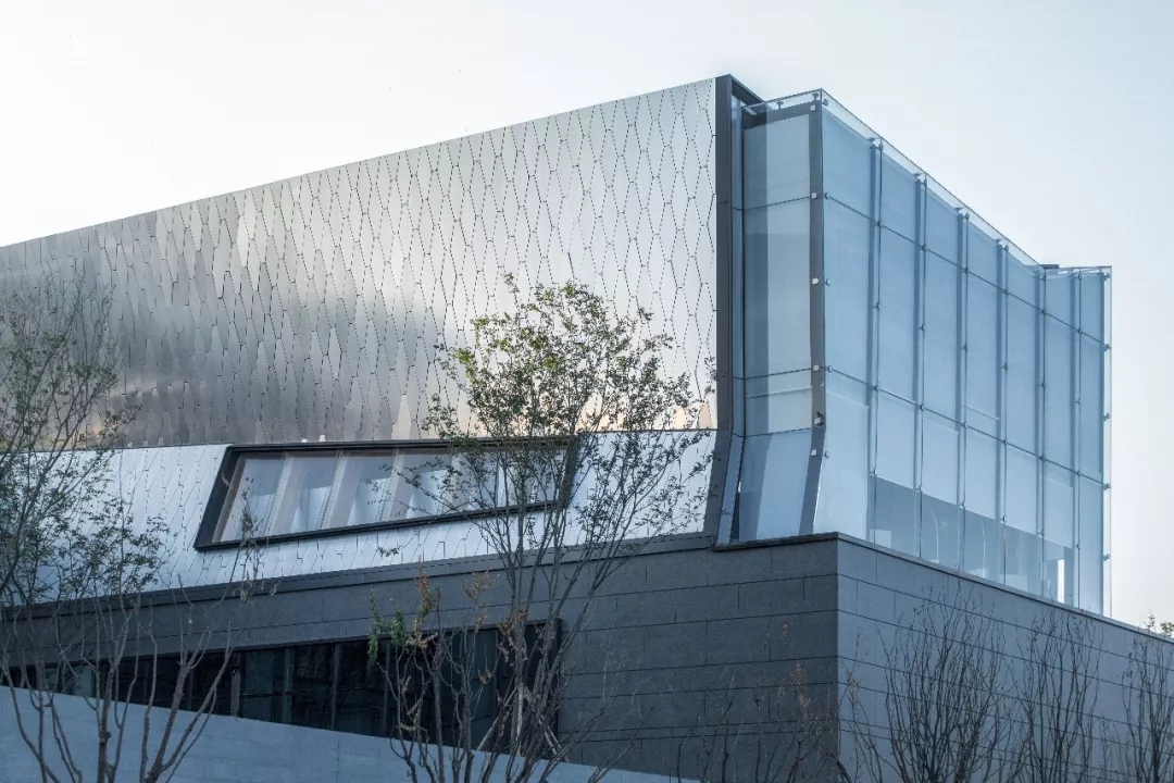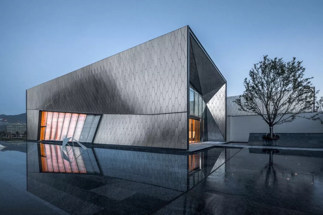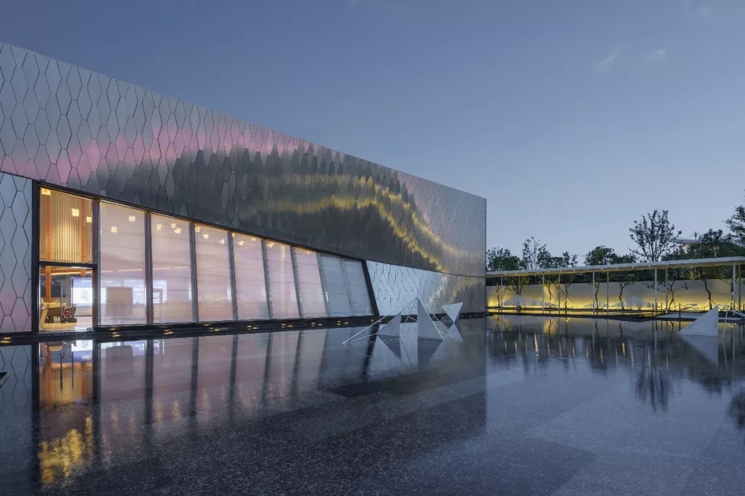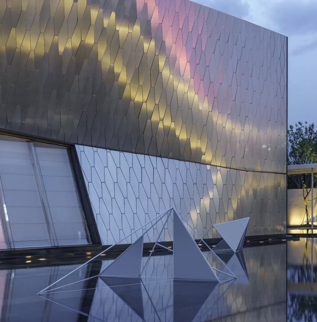 建筑師以六邊形鋁板作為主要界面材料,覆蓋于內部結構之上。表皮順應真實的建筑形態變化,每塊蜂窩鋁板精細包邊,開縫拼掛,細節考究。數字化的表現手法營造 出“Cyberpunk”(賽博朋克)的超時空現代感,表皮在自然光下形塑特質,追隨光線的變化,產生復雜而神秘的視覺效果。
