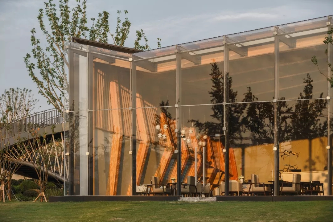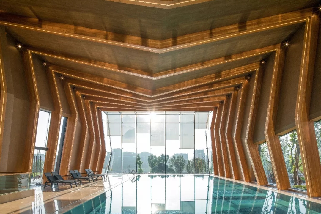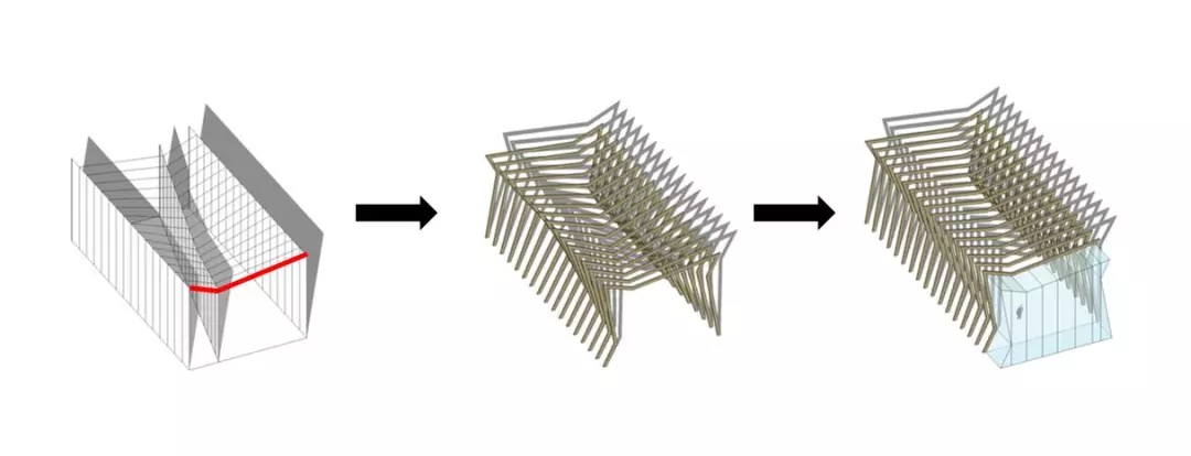 暴露的膠合木結構構件是建筑中最重要的視覺元素。建筑師以重慶傳統的折坡屋頂秩序的形式語言轉換成為建筑形體,抽取變化的單元模式轉為結構構件,多片構件以秩序和變化排列組合,產生緊密的空間與形體的變化。