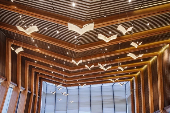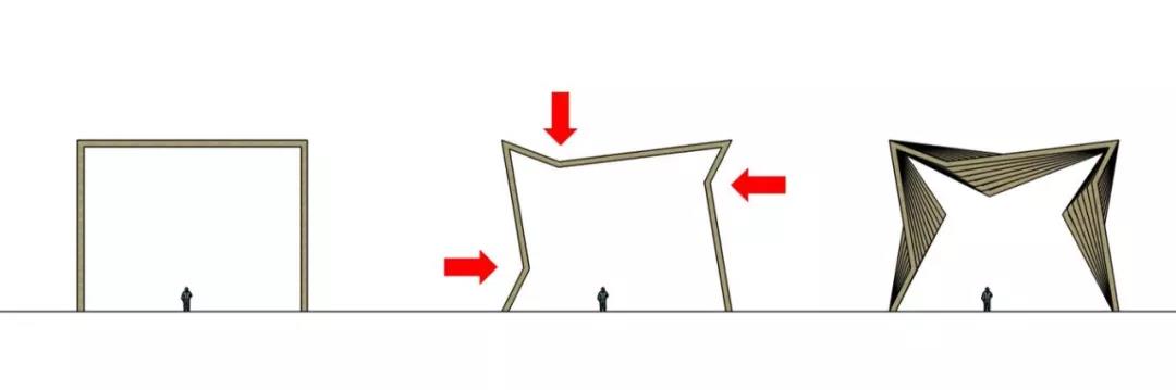 木構件筆直搭接,嚴整清晰,建構感強。流暢的線條和統一的韻律感使建筑空間極具張力。構件體現出的動態平衡,豐富了建筑語言,將空間變得非常具有戲劇化。