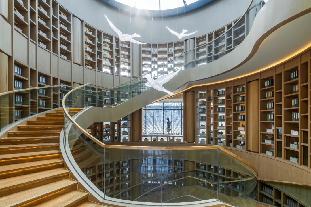 設計師將書院定義成一個能讓人閱讀、思考、安靜下來的場所,并希望成為閱讀者的場所記憶,生活方式通過書院的一呼一吸中不斷進行新陳代謝。書院中旋轉迂回的樓梯,書架環繞,頂部引入自然光,呈現流動靈活卻有震撼力的空間,光線的變化還使讀者感受到時間的游走。