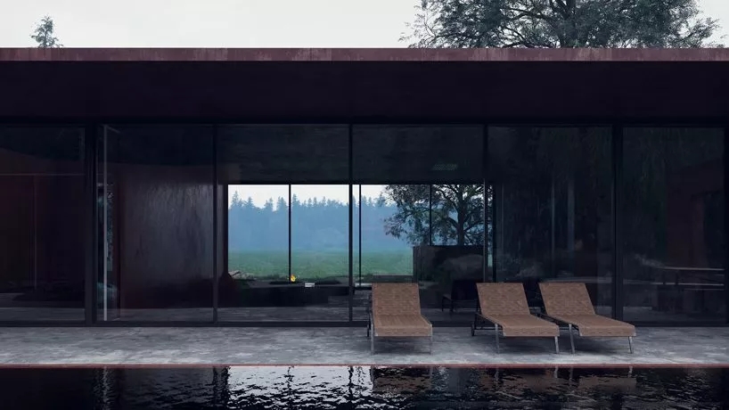 面向水池的立面設有一大片落地窗,房子的構造、顏色讓住客感覺身處于大自然之中。