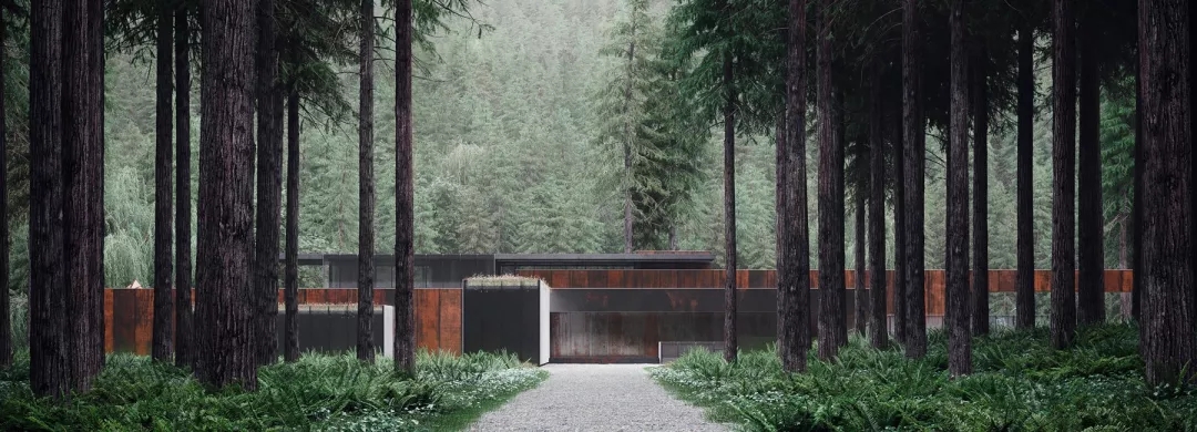 這座建筑運用了混凝土、耐候性鋼材、玻璃和水等元素。