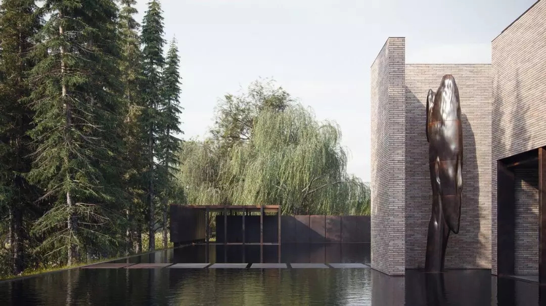 建筑師還設計了一個人造水池,使水成為了與混凝土,玻璃和鋼材同樣重要的材料。位于游泳池的雕像是烏克蘭藝術家納扎爾·貝利克創造的“雨”。