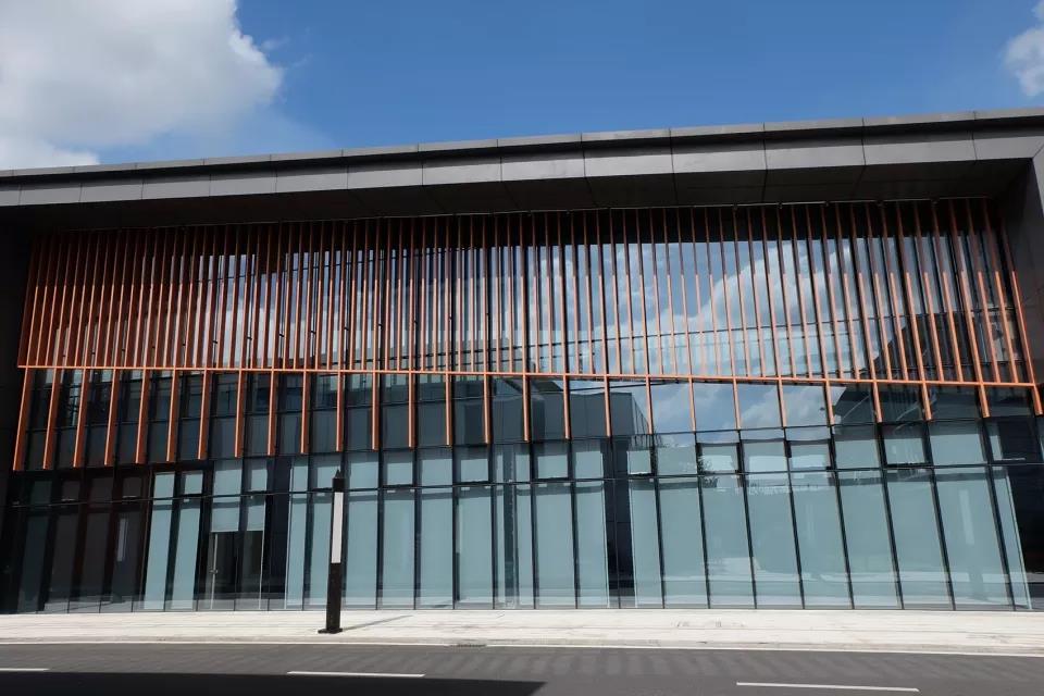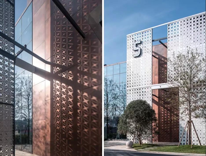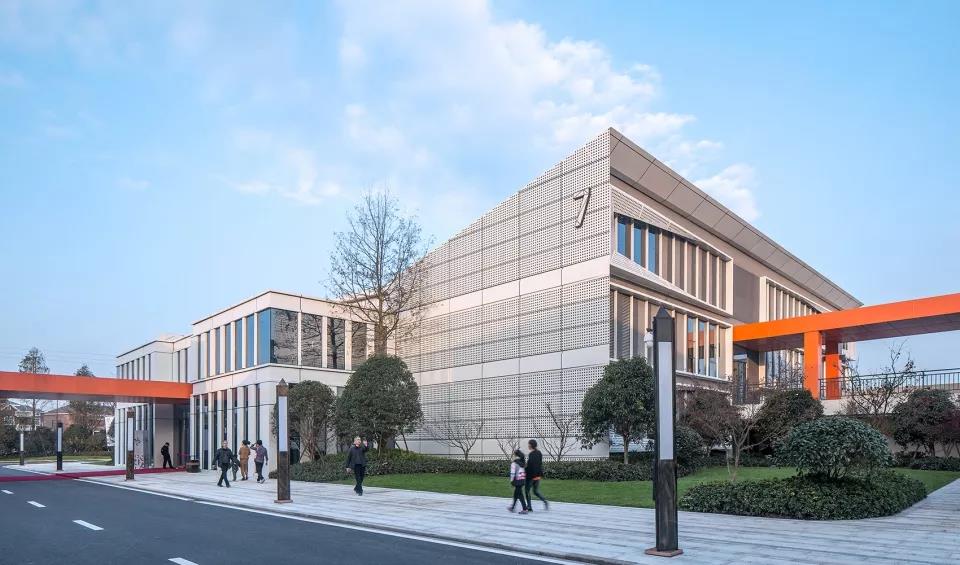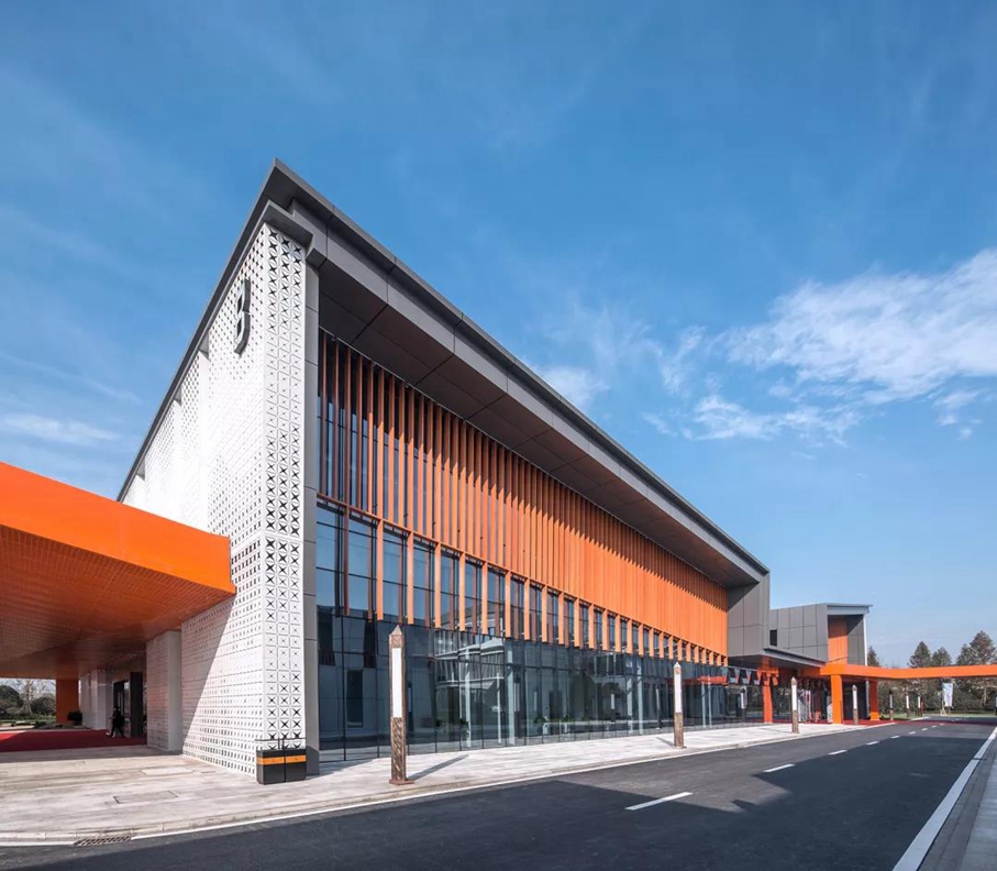 建機(jī)場項(xiàng)目隨處可見橙色與純白形成的視覺沖擊,呼應(yīng)龍門吊的原生色彩。新建外墻面則采用耐候鋼板,以其鐵銹質(zhì)感與歷史貼合。大型辦公建筑外圍立面鋪設(shè)鋁合金穿孔板遮陽百葉,現(xiàn)代化的光孔形態(tài)使得立面在不同時(shí)段的陽光下都享有豐富的變化。