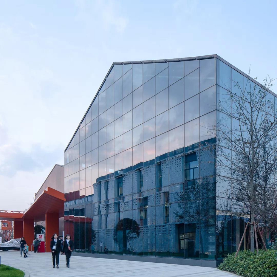 不同于原有廠房所訴求工業(yè)屬性的遺存,新建廠房的創(chuàng)造更注重尋求形意的表達(dá)。衍變自良渚文化的典型器物玉琮,取自其橫向線條和轉(zhuǎn)折關(guān)系,解構(gòu)重建賦予立面,起到不同的遮陽作用。同時(shí),用粗細(xì)變化的彩釉玻璃,營造建筑立面的光澤變化,表現(xiàn)建筑如玉般細(xì)膩的質(zhì)感,展示良渚古老的文化歷史。