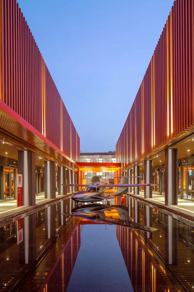30公分鏡面薄水與飛機(jī)模型交映,化解建筑體量感。開放木質(zhì)平臺,在親水的環(huán)境下配合局部開敞的草地和喬灌木,形成錯(cuò)落有致的戶外交流空間。