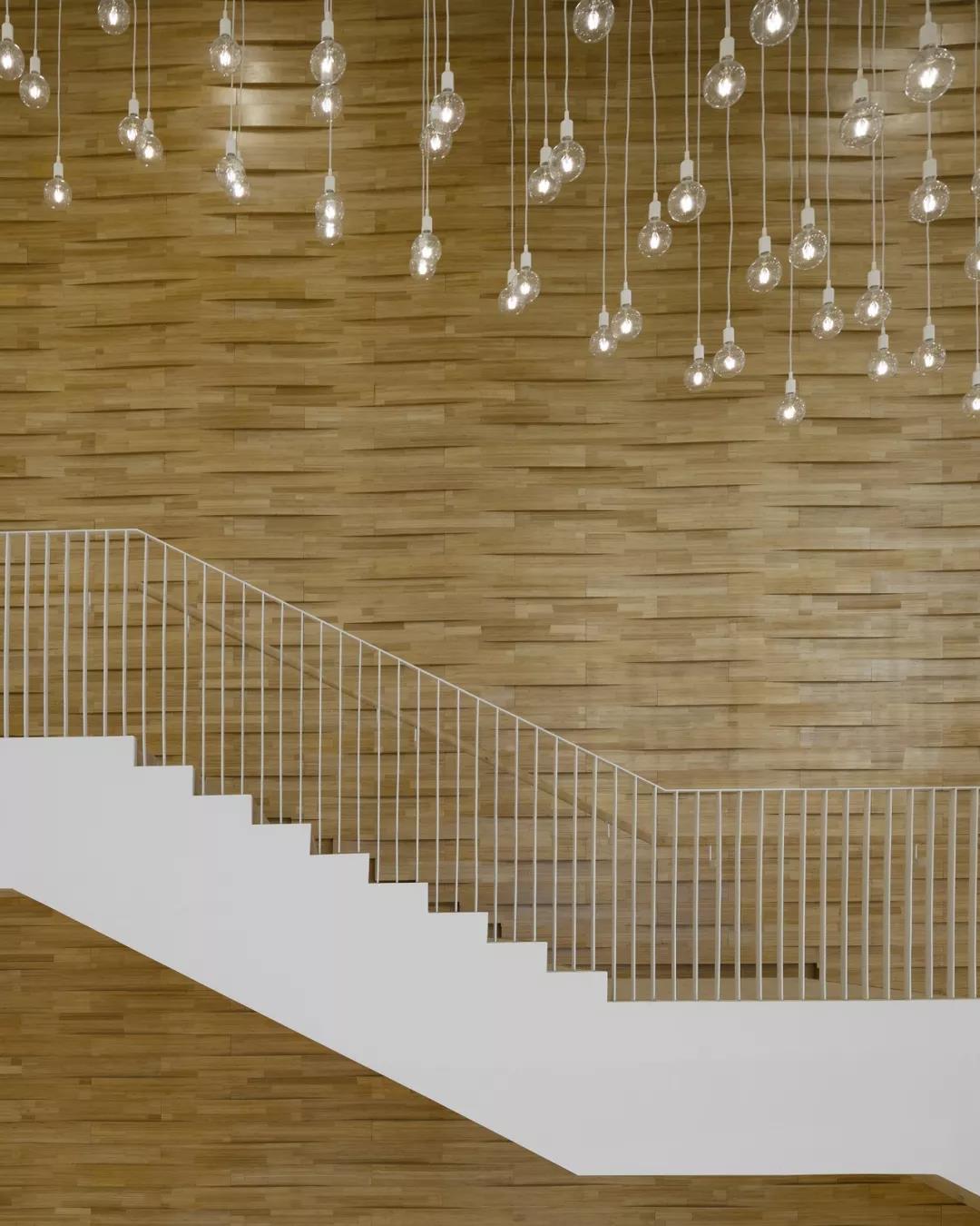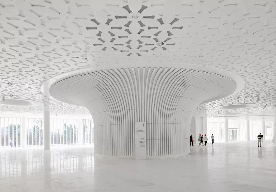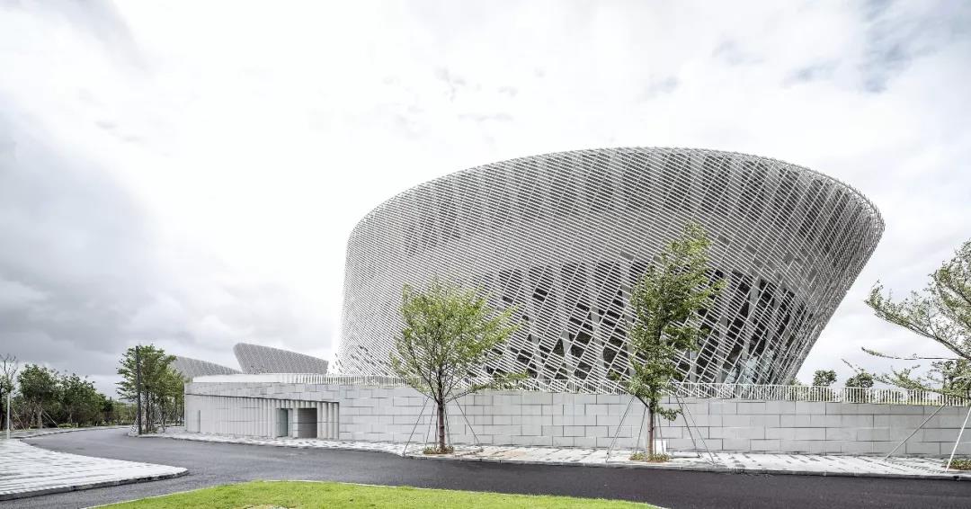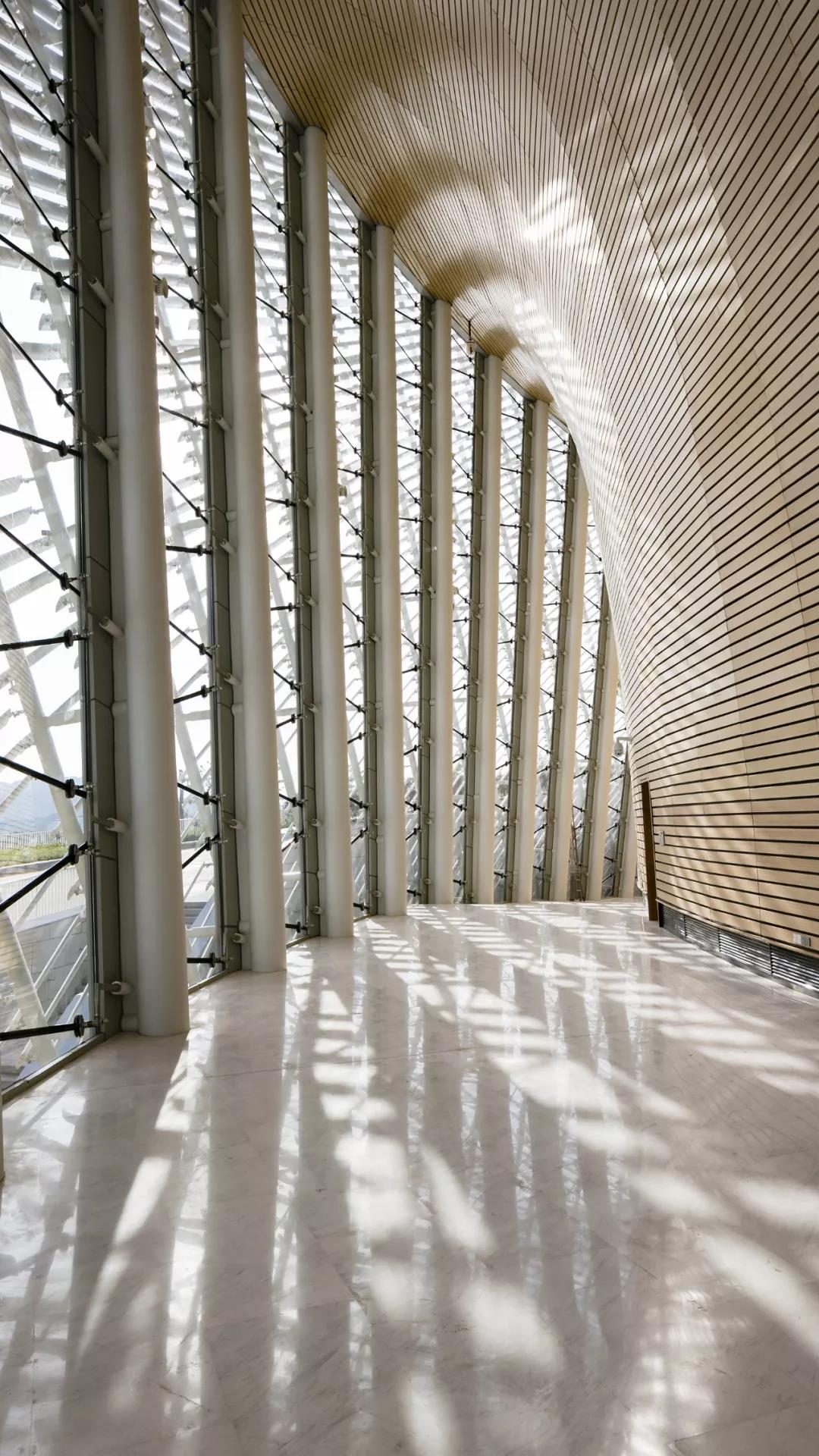 PES建筑設計事務所與臺灣陶瓷藝術家 Samuel Hsuan-yu Shih 合作,使用著名的“漢白玉”材料為兩個主禮堂設計了藝術陶瓷內飾,并采用了全新的科技以滿足場館的聲學要求。另外,所有的立面也都覆蓋著白色的瓷磚和百葉窗。