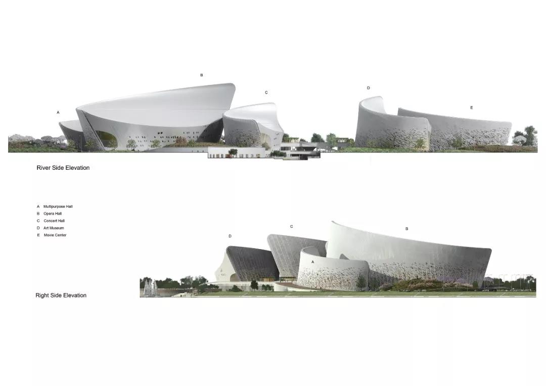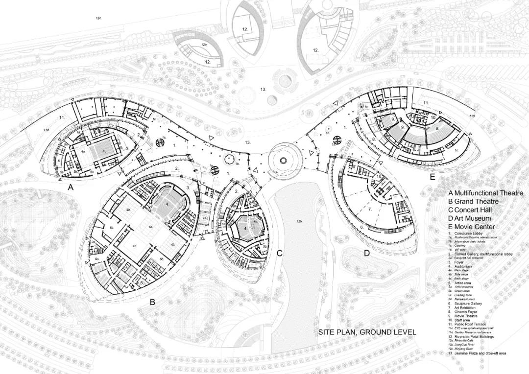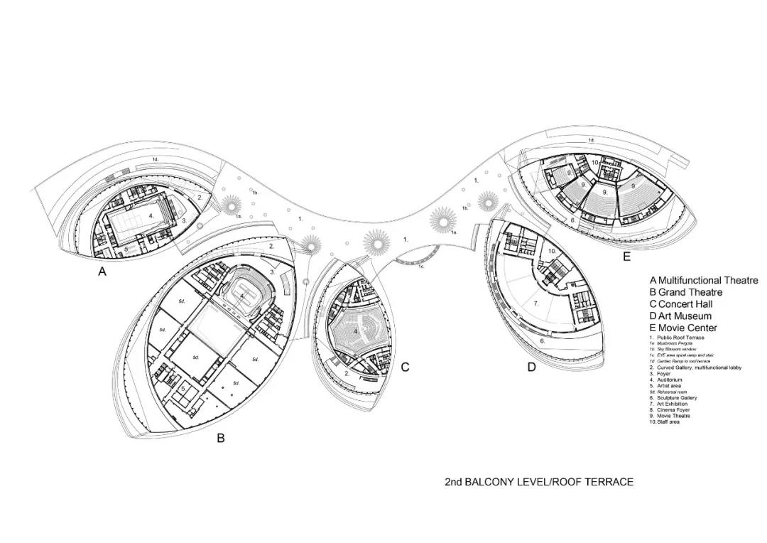 場地中共有五個場館,就似五瓣茉莉花花瓣一般。場館里包括歌劇院(1600個座位)、音樂廳(1000個座位)、多功能劇院、藝術展廳和電影中心,這五個體量由一個共通的文化大廳(Cultural Concourse)和一個大型的屋頂露臺相連。