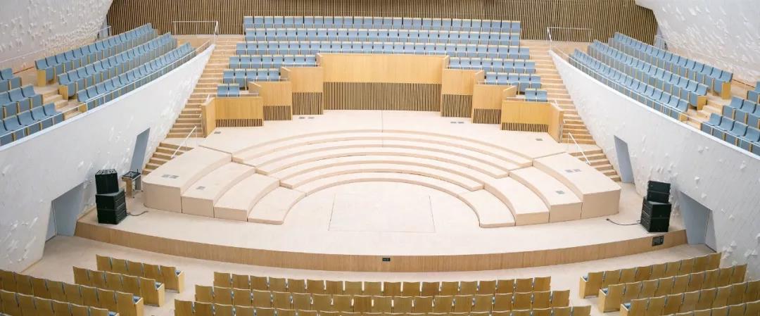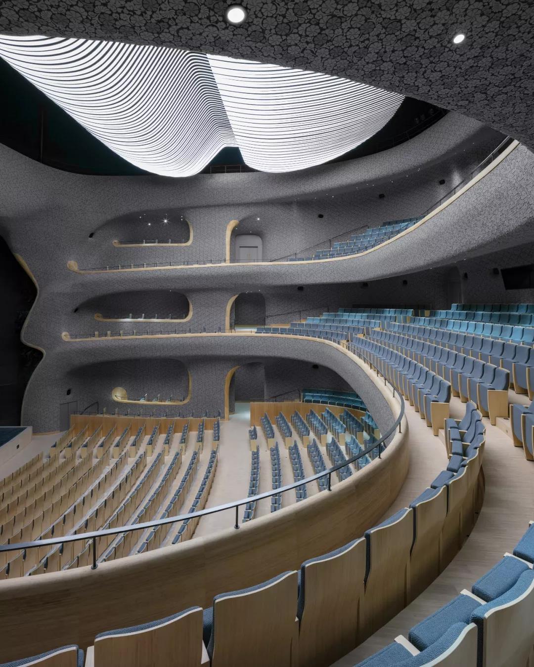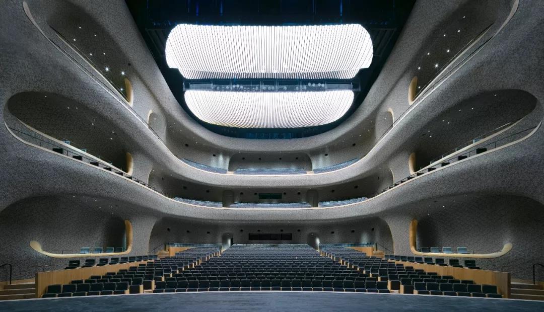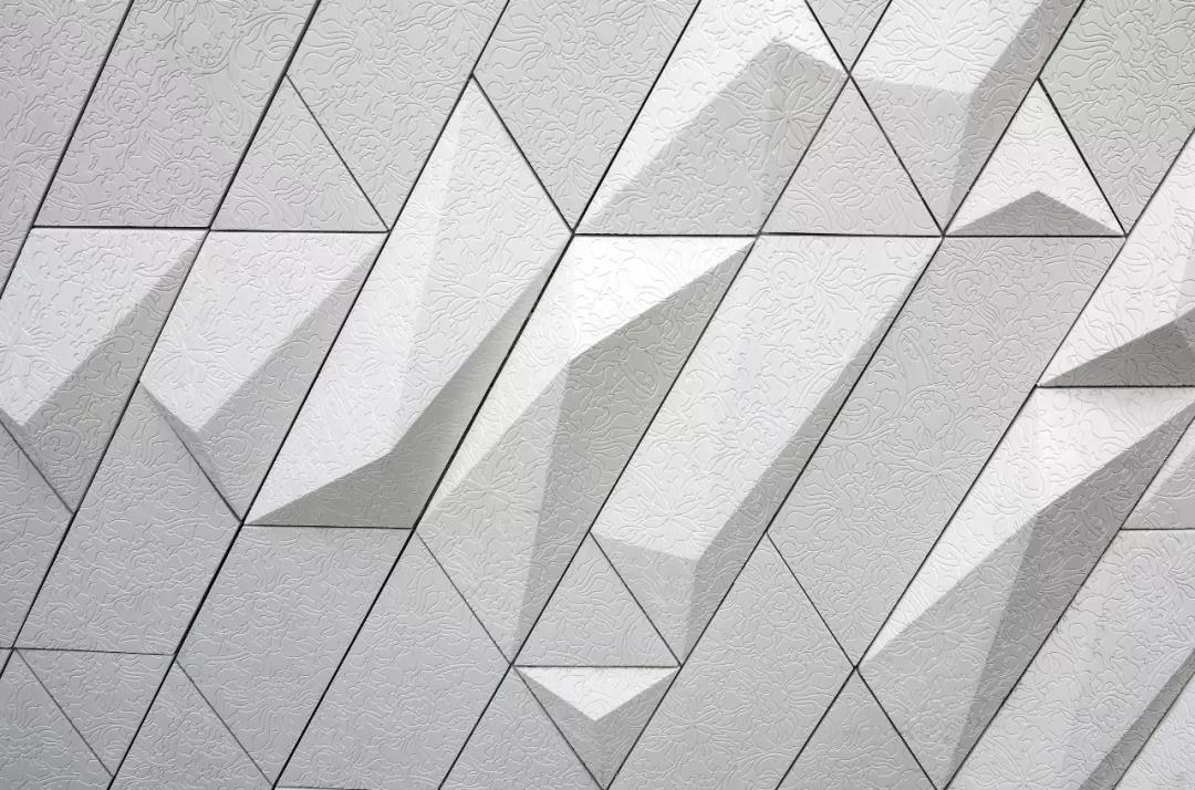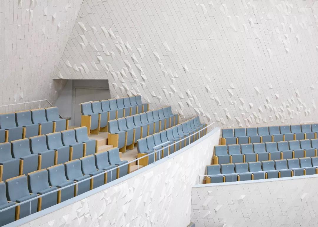歌劇院和音樂廳的內部墻面采用了幾何形狀的陶瓷板貼面。基于聲學家的研究,我們開發了兩種聲學面板:雕刻面板和馬賽克瓷磚面板。這兩種面板都可以實現很好的聲學效果,同時也具備很好的裝飾性。