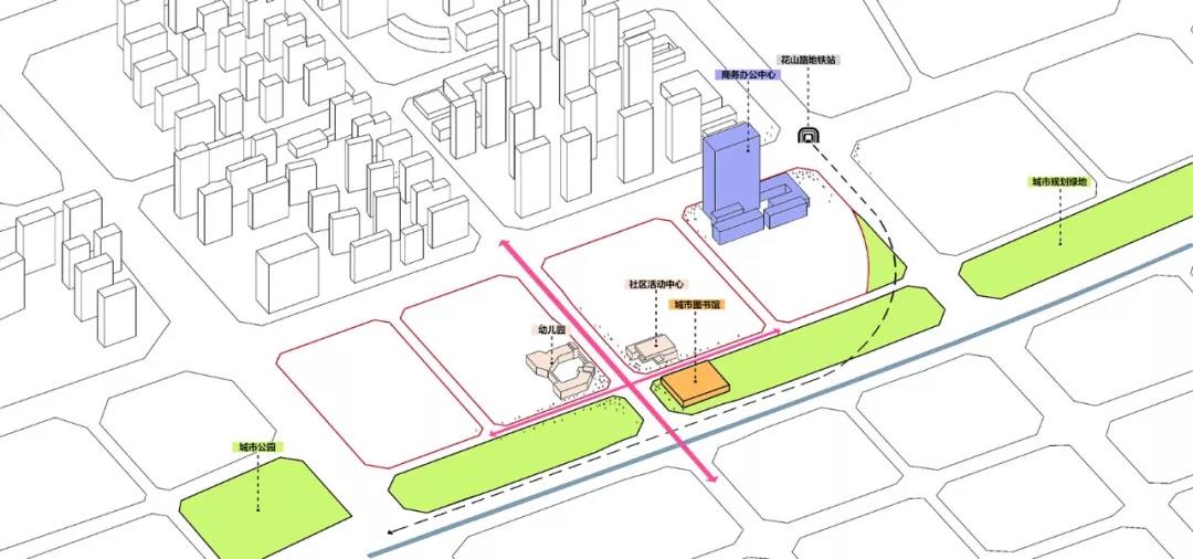 整個項目中結合城市規(guī)劃綠地,打造為綠軸邊上的多主體的城市花園型綜合居住社區(qū)。交流與互動需求、功能變化與銜接、建筑與景觀的融合性思辨等諸多復雜挑戰(zhàn),使項目產(chǎn)生了在哲學意味上曖昧而溫和的不界定的結論,最終結合圖書館和幼兒園、社區(qū)中心,創(chuàng)造了一個積極而富有生機活力的街區(qū)。