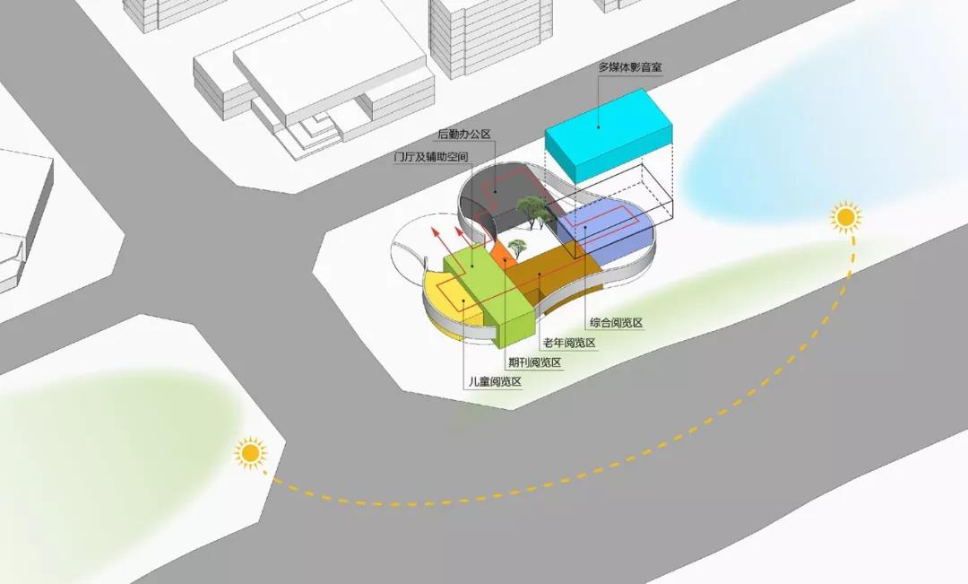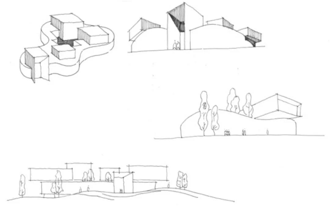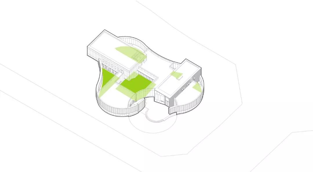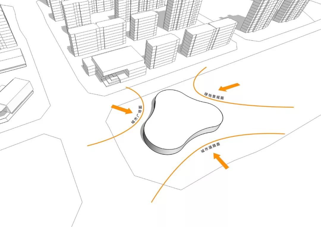平面布局設置中將場地中央作為室外活動中心,幾乎所有交通流線組織、空間內(nèi)外轉換都圍繞場地中心展開,周邊的建筑實體在迎合中心形虛而神實的召喚中,產(chǎn)生著不確定的扭動與流動,體量由此愈加有趣而豐富。