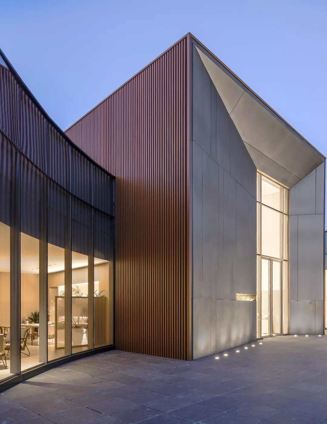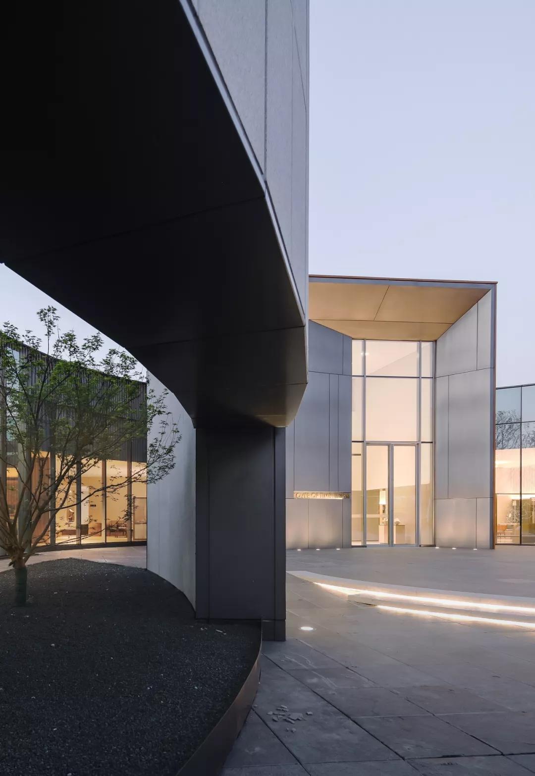 大面積黑白灰的運用使得建筑本身的雕塑感更為強烈,褐色的點綴帶來溫度感。而玻璃的穿插與水的流動則打消了可能的沉悶,水是輕盈,也是吸引,玻璃則聯(lián)通室內(nèi)外空間,帶來光與影、空間與時間的對話。白天或者黑夜,自然亦或匠心,光的穿插給予這座雕塑空間通透之感,虛虛實實,似城市中一座浮島。
