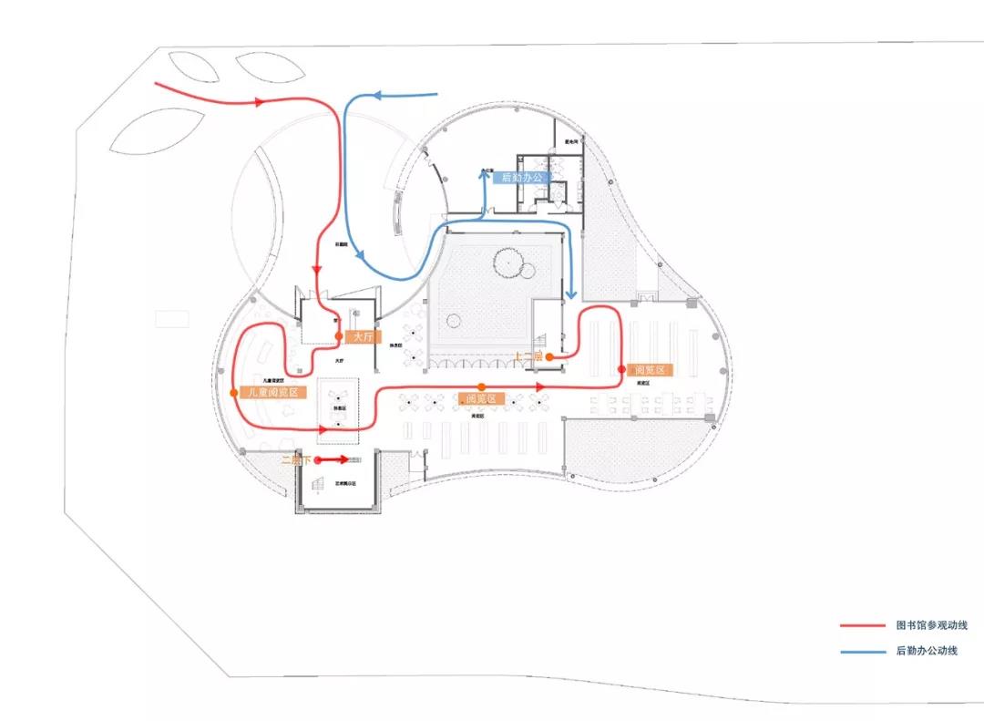 室內(nèi)空間是建筑外部空間、建筑形態(tài)元素的延續(xù)和衍生,我們希望在這樣一條洄游線中,人與空間可以達到和諧統(tǒng)一,從而造就建筑功能性之外的精神歸屬感。這樣的洄游線處于室內(nèi),卻也延伸至外,溝通了建筑、景觀與公眾的關系,像是眼中所見之物各自連接,各自安排,都處于這條線中。它是不斷延伸的,跟隨我們腳步,走出這里的地塊,向整個城市發(fā)展。