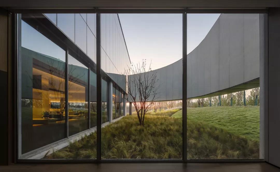 中心有庭院,繞綠自心安。從圖書館二樓俯瞰,便可見一塊方正的綠,抬望眼,景觀天際線自然起伏。圖書館內(nèi)部景觀庭院與室內(nèi)空間有序的穿透著,室內(nèi)空間與外部空間則以玻璃相隔,一層使用高透玻璃打造通透之感,豐富“浮島”意味,二層則以磨砂玻璃作隔,隱隱映出環(huán)境之色的同時,給內(nèi)部空間以足夠的掩抑。如此,室內(nèi)陳設與外界景物相得益彰。
